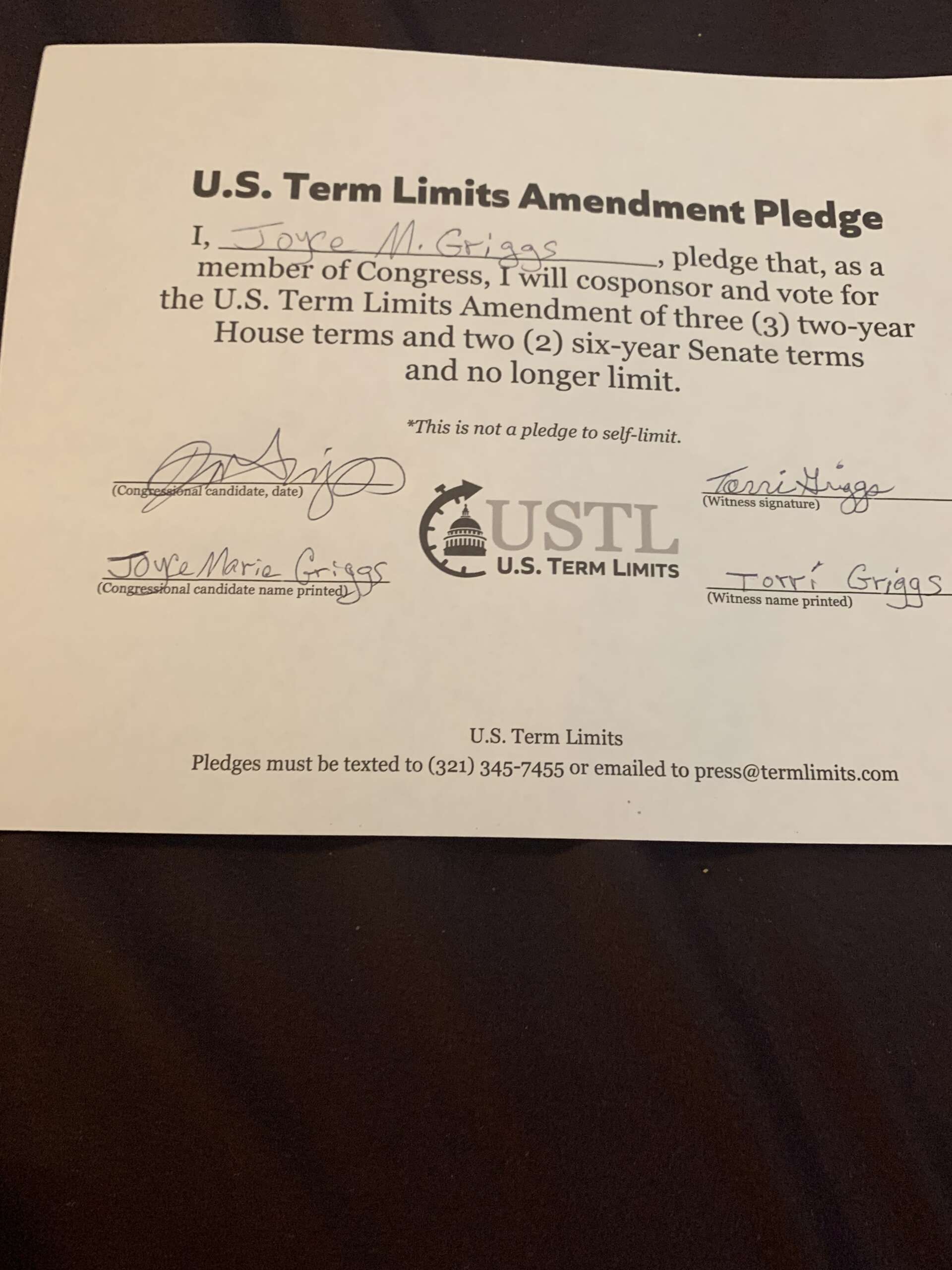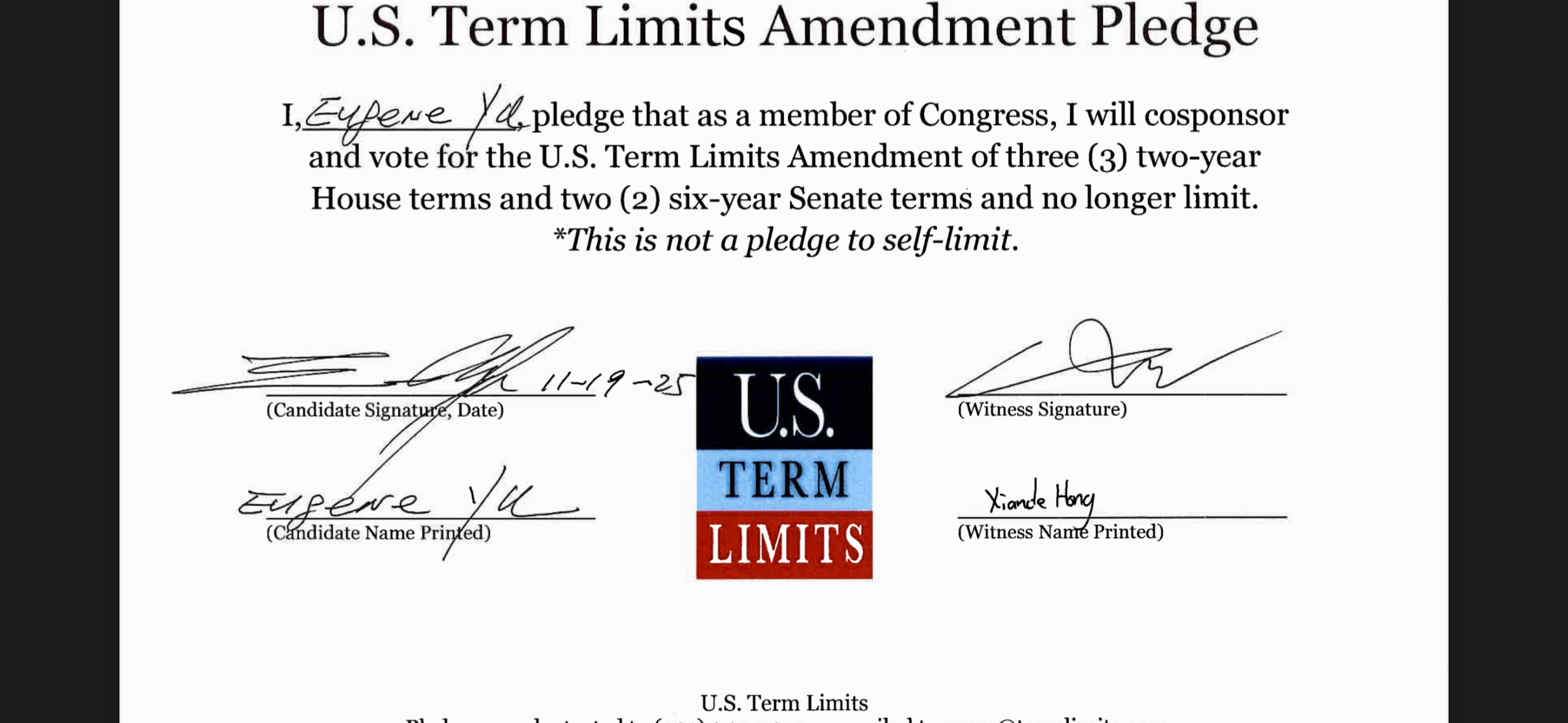 The U.S. Term Limits amendment pledge is provided to every announced candidate for federal office. It reads, “I pledge that as a member of Congress, I will cosponsor and vote for the U.S. Term Limits amendment of three (3) two-year House terms and two (2) six-year Senate terms and no longer limit.”