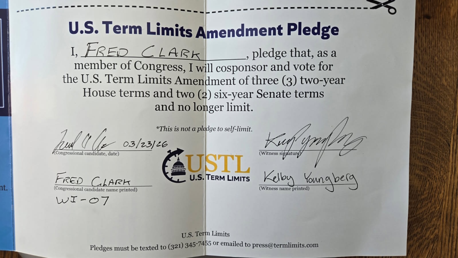 Washington D.C. – U.S. Term Limits (USTL), the leader in the non-partisan national movement to limit terms for elected officials, praises 2026 U.S. House candidate for Wisconsin, Fred Clark (district 7), for signing the pledge for an amendment to term limit Congress. Previously, candidates Kevin Hermening, Ginger Murray, Michael Alfonso and Jessi Ebben also signed the pledge.