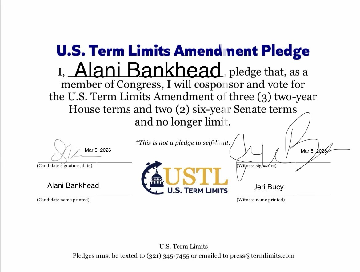 The U.S. Term Limits amendment pledge is provided to every announced candidate for federal office. It reads, “I pledge that as a member of Congress, I will cosponsor and vote for the U.S. Term Limits amendment of three (3) House terms and two (2) Senate terms and no longer limit.”