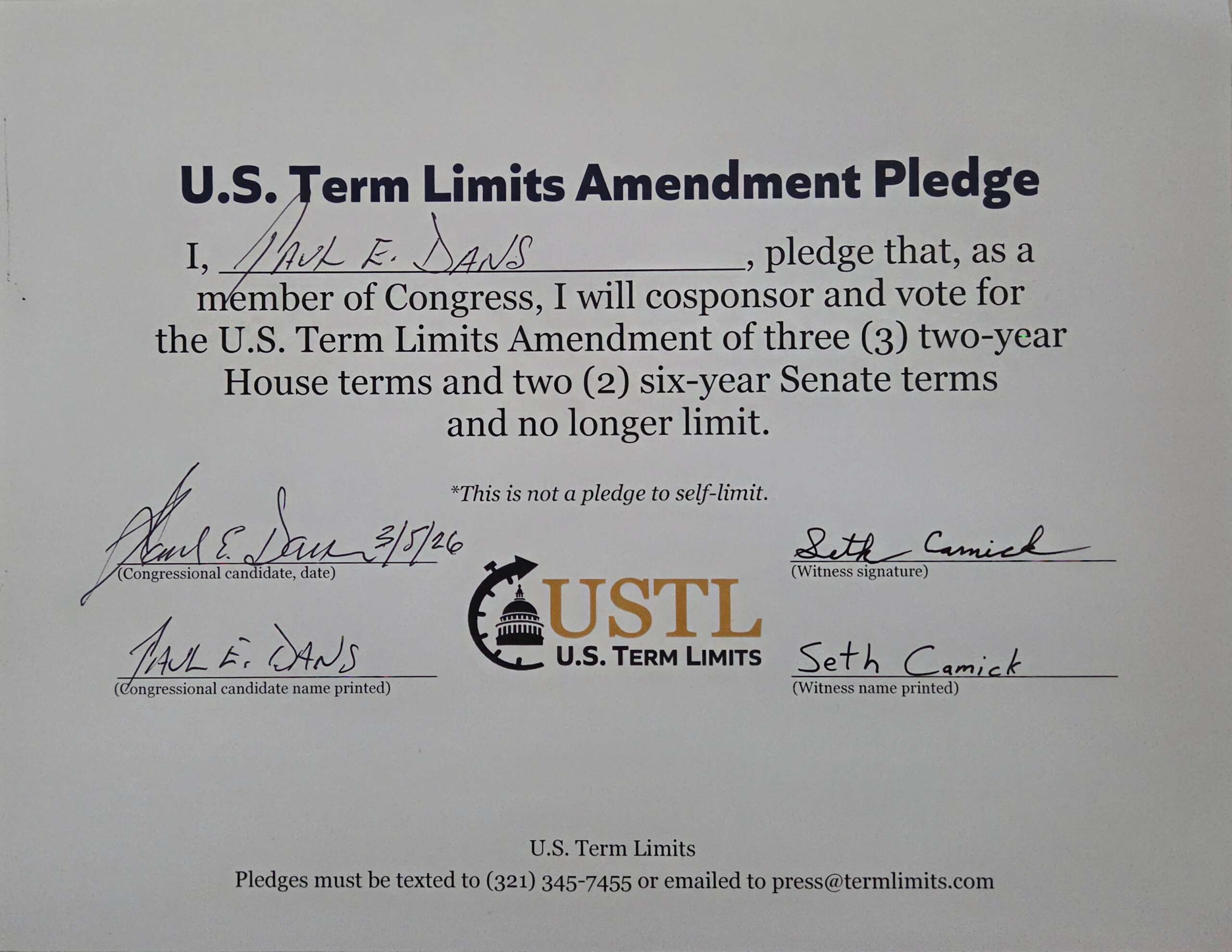 Washington D.C. – U.S. Term Limits (USTL), the leader in the non-partisan national movement to limit terms for elected officials, praises 2026 U.S. Senate candidate for South Carolina, Paul Dans, for signing the pledge for an amendment to term limit Congress. Previously, candidates Don Louis, Mark Lynch, Kyle Freeman, and Annie Andrews also signed the pledge.