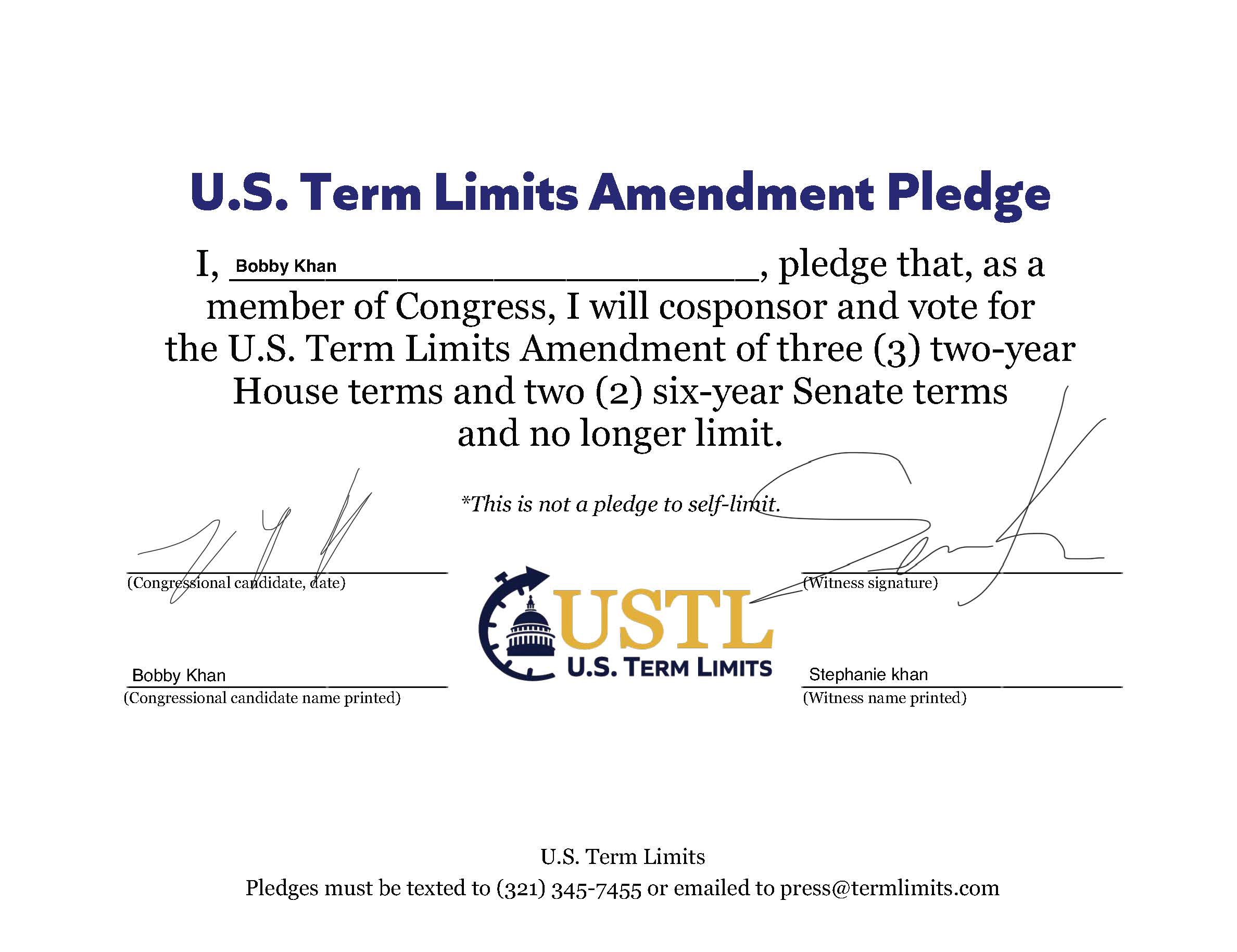 Washington D.C. – U.S. Term Limits (USTL), the leader in the non-partisan national movement to limit terms for elected officials, praises 2026 U.S. House candidate for Nevada, Bobby Khan (district 1), for signing the pledge for an amendment to term limit Congress. Previously, candidates Jim Blockey, Joy Hoover, Carrie Buck, Gabriel Cornejo and Jim Marchant also signed the pledge.