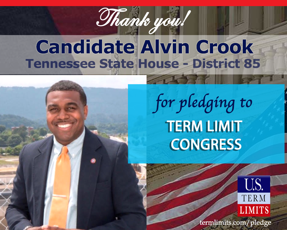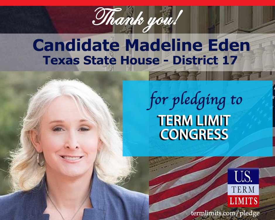 The U.S. Term Limits amendment pledge is provided to every announced candidate for federal office. It reads, “I pledge that as a member of Congress, I will cosponsor and vote for the U.S. Term Limits amendment of three (3) two-year House terms and two (2) six-year Senate terms and no longer limit.”