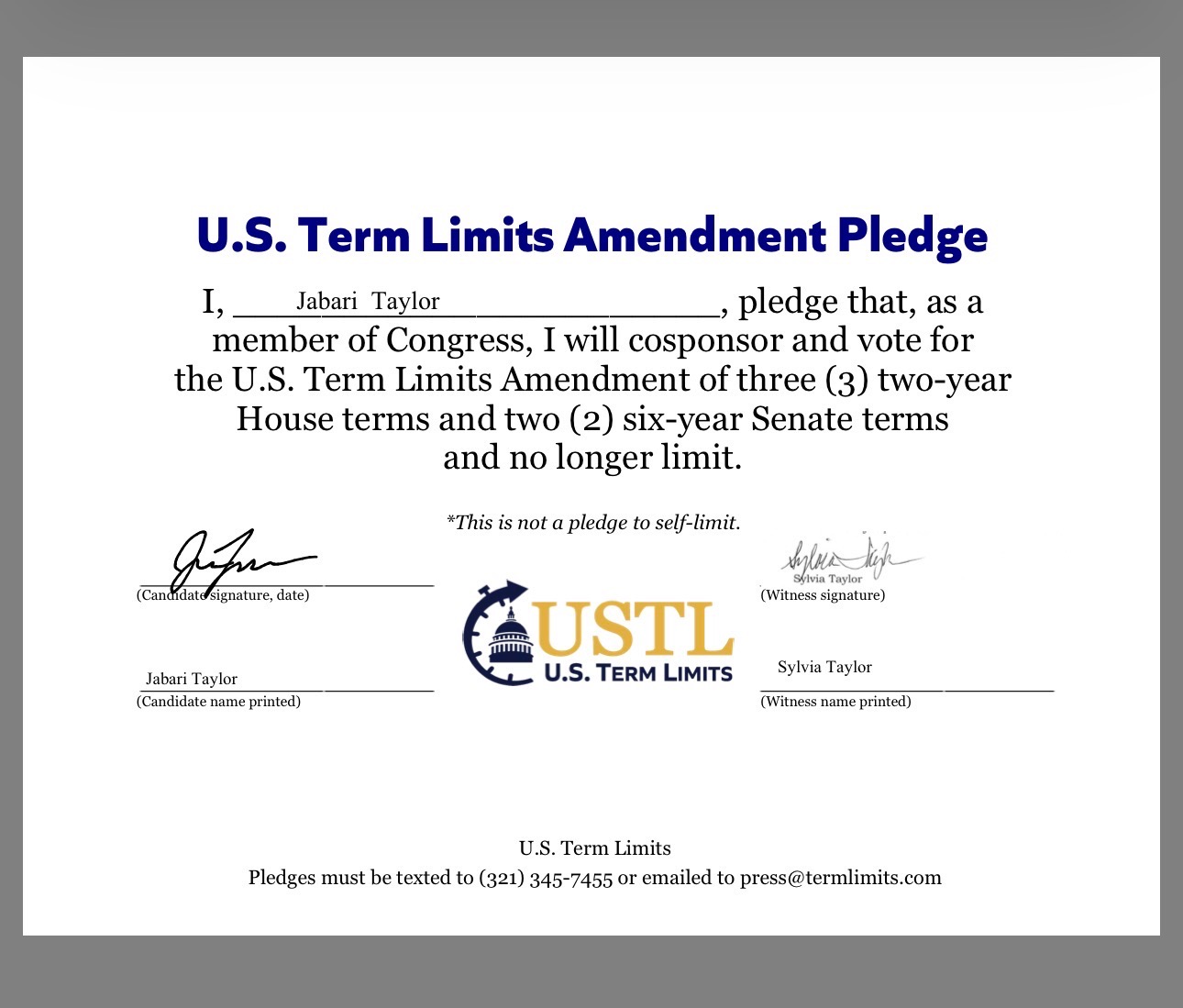 Washington D.C. – U.S. Term Limits (USTL), the leader in the non-partisan national movement to limit terms for elected officials, praises 2026 U.S. House candidate for Illinois, Jabari Taylor (District 7), for signing the pledge for an amendment to term limit Congress. Previously, candidates Anabel Mendoza, Patricia Easley, Reed Showalter, Kina Collins, and Chad Koppie also signed.