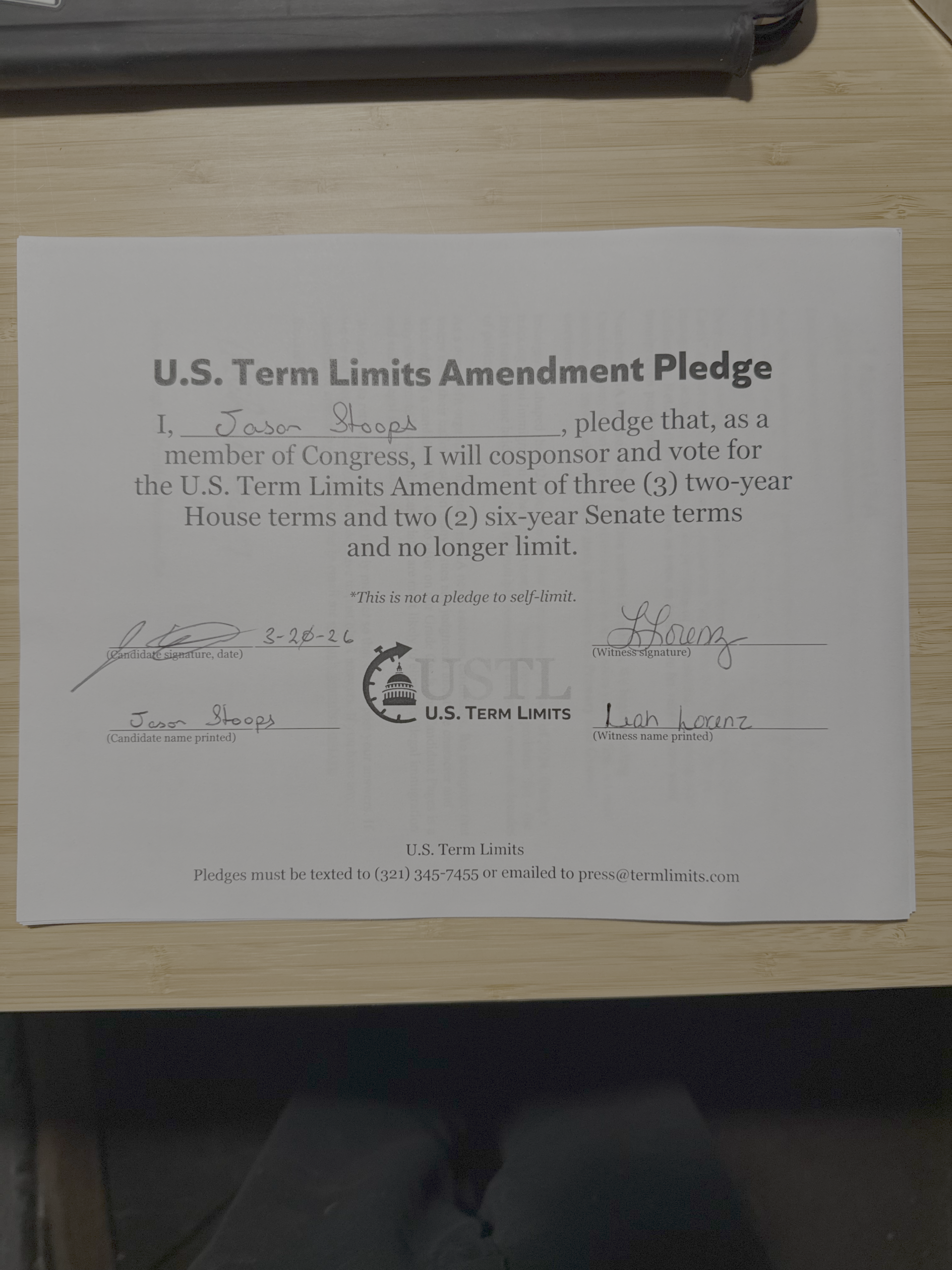 Washington D.C. – U.S. Term Limits (USTL), the leader in the non-partisan national movement to limit terms for elected officials, praises 2026 U.S. House of Representatives candidate for Ohio, Jason Stoops (district 1), for signing the pledge for an amendment to term limit Congress. Previously, candidates John Hancock, Steven Erbeck, Rosemary Oglesby-Henry, Eric Conroy, and Incumbent Rep. Greg Landsman signed the pledge.