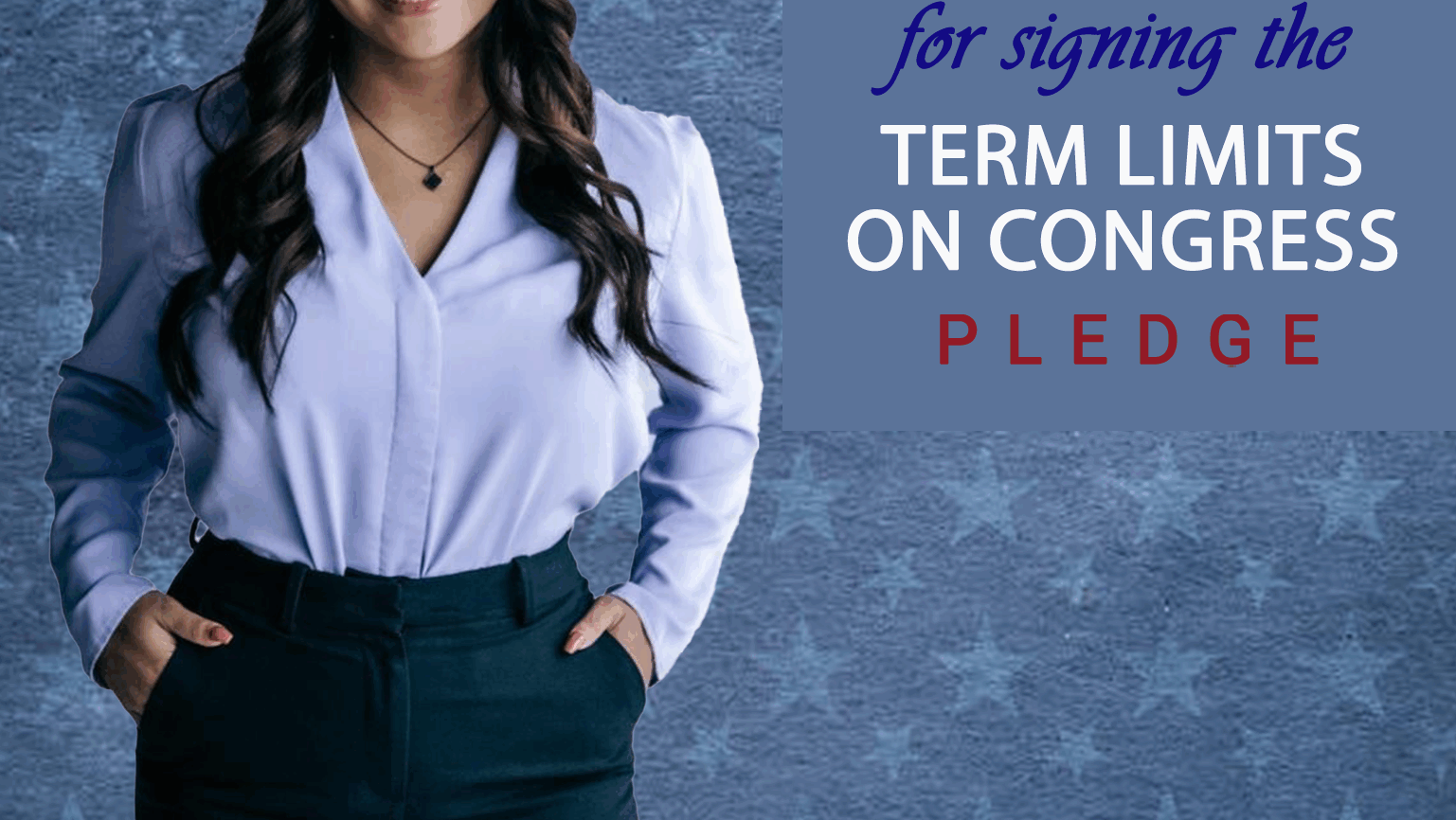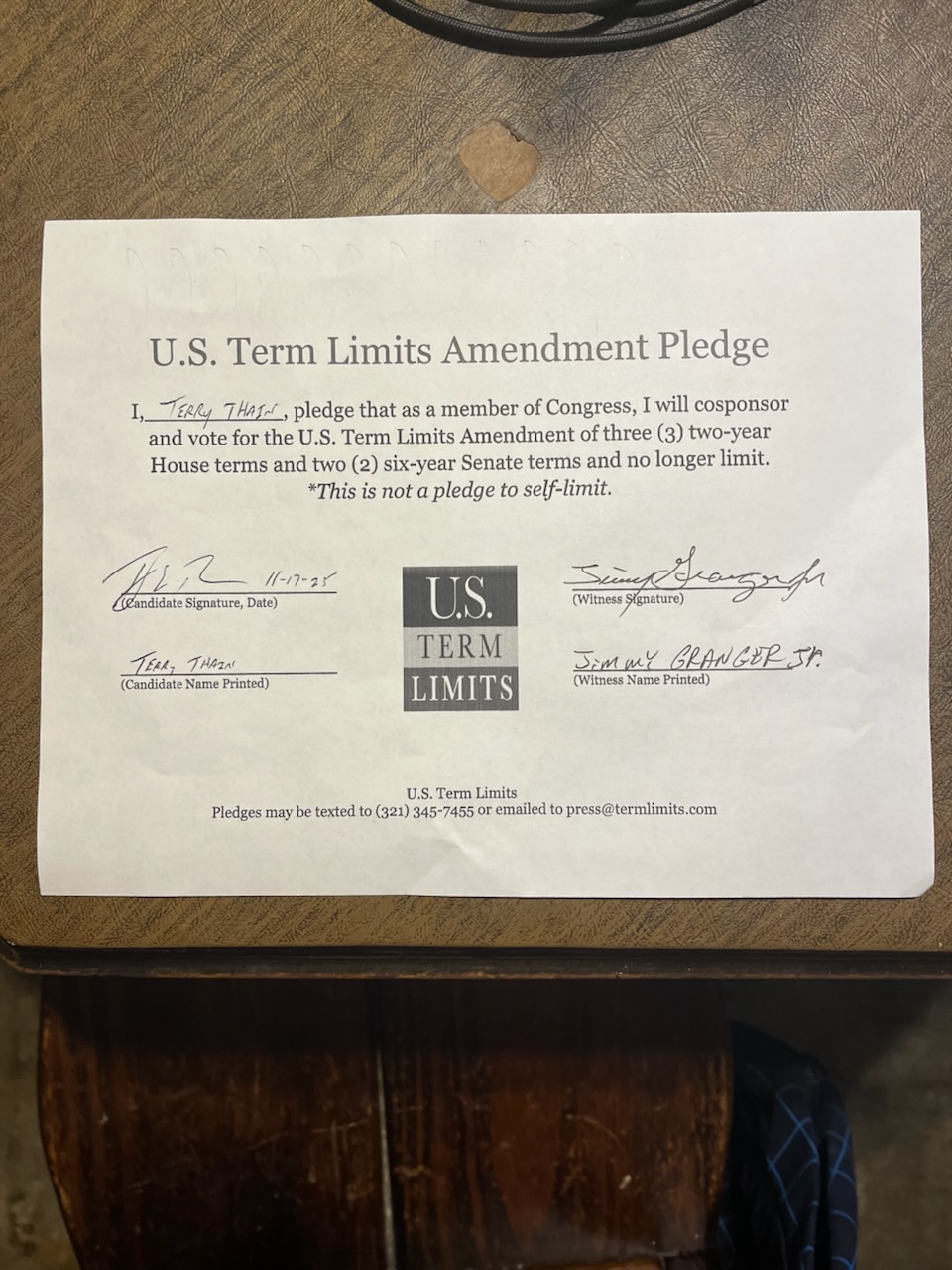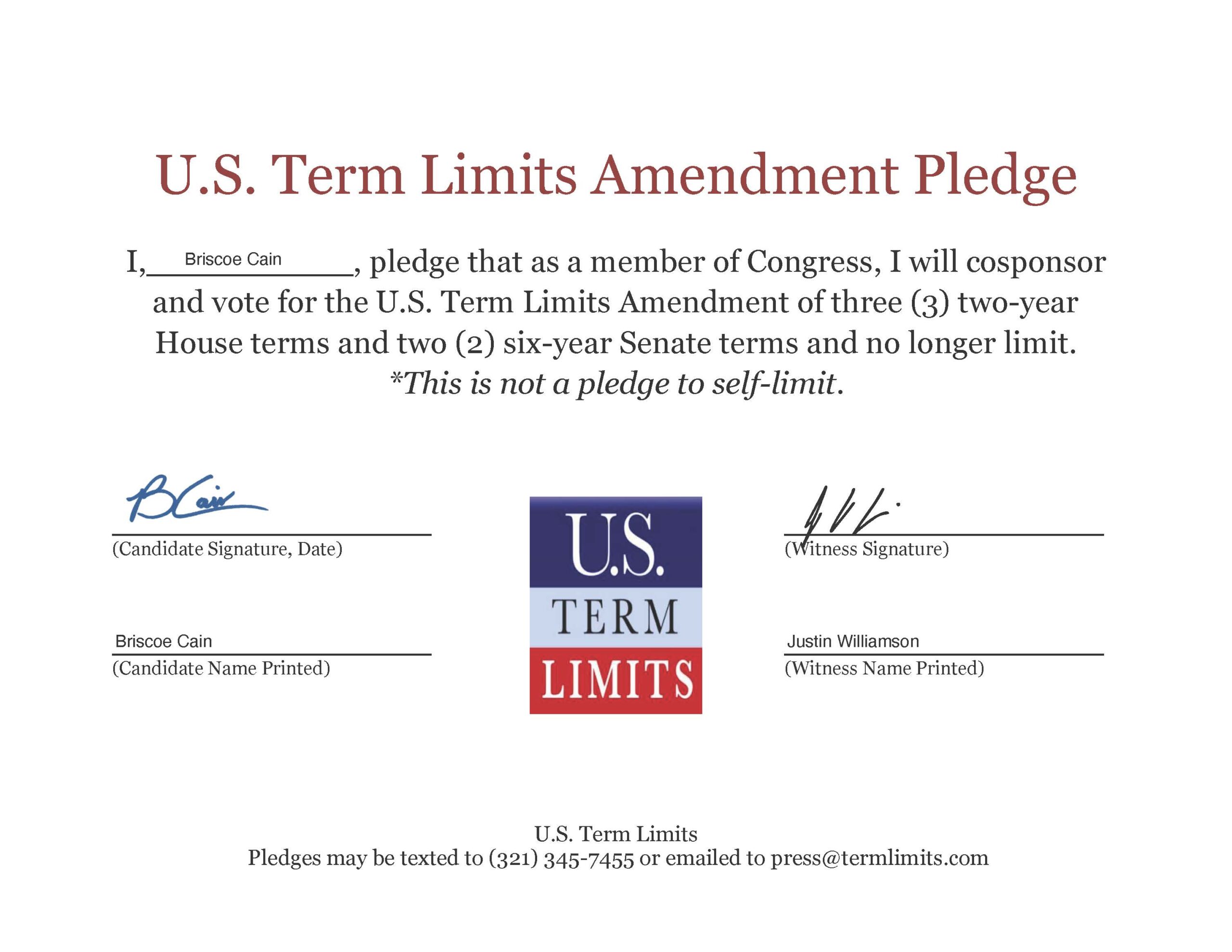 The U.S. Term Limits amendment pledge is provided to every announced candidate for federal office. It reads, “I pledge that as a member of Congress, I will cosponsor and vote for the U.S. Term Limits amendment of three (3) House terms and two (2) Senate terms and no longer limit.”