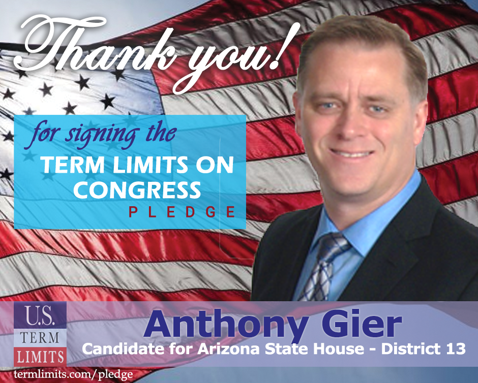 The U.S. Term Limits amendment pledge is provided to every announced candidate for federal office. It reads, “I pledge that as a member of Congress, I will cosponsor and vote for the U.S. Term Limits amendment of three (3) two-year House terms and two (2) six-year Senate terms and no longer limit.”