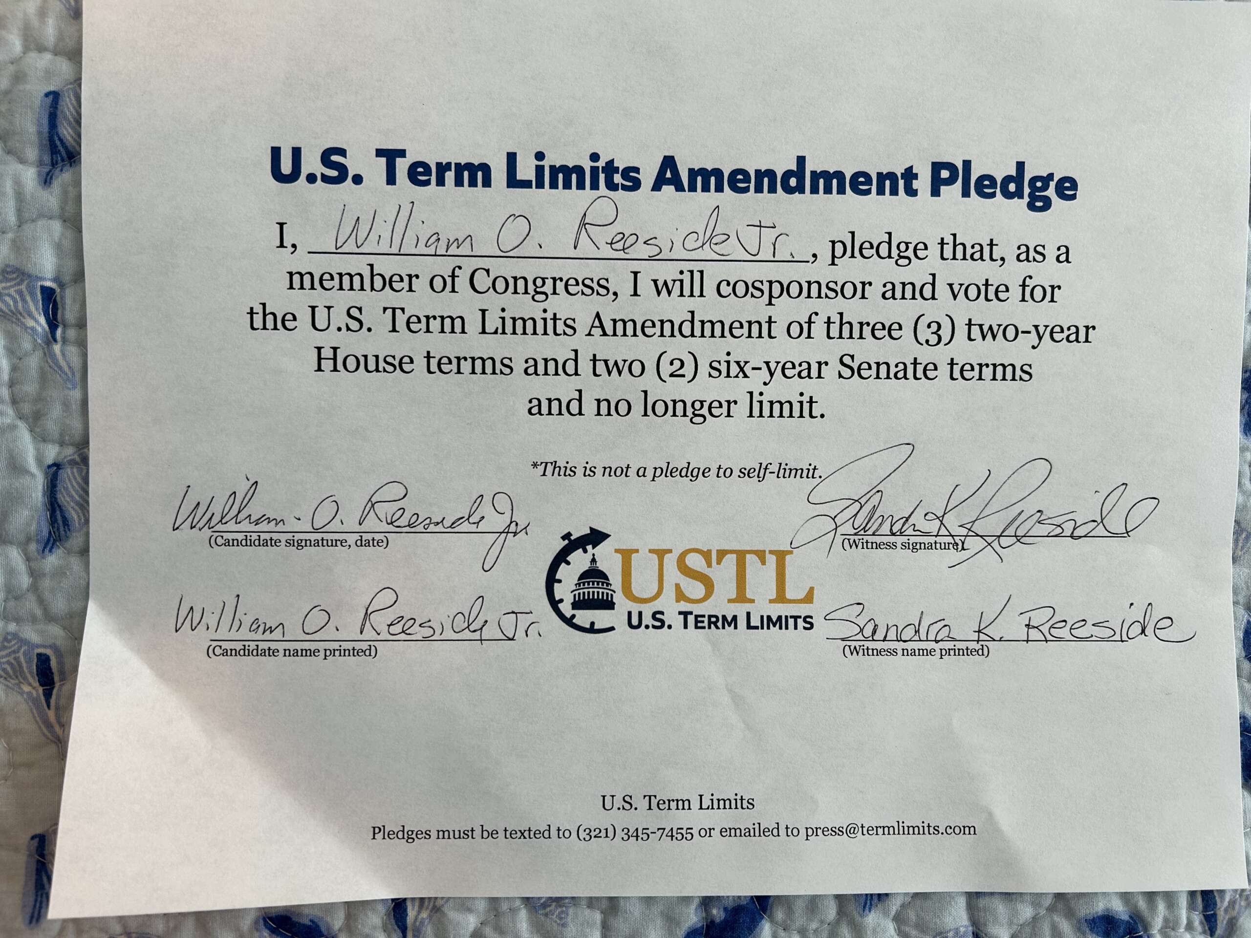 Washington D.C. – U.S. Term Limits (USTL), the leader in the non-partisan national movement to limit terms for elected officials, praises 2026 U.S. House of Representatives candidate for South Carolina, Bill Reeside (district 1), for signing the pledge for an amendment to term limit Congress. Previously, candidates Jenny Honeycutt, Tyler Dykes, Alex Pelbath, Sam McCown, Mark Sanford and Rep. Mark Smith also signed the pledge.