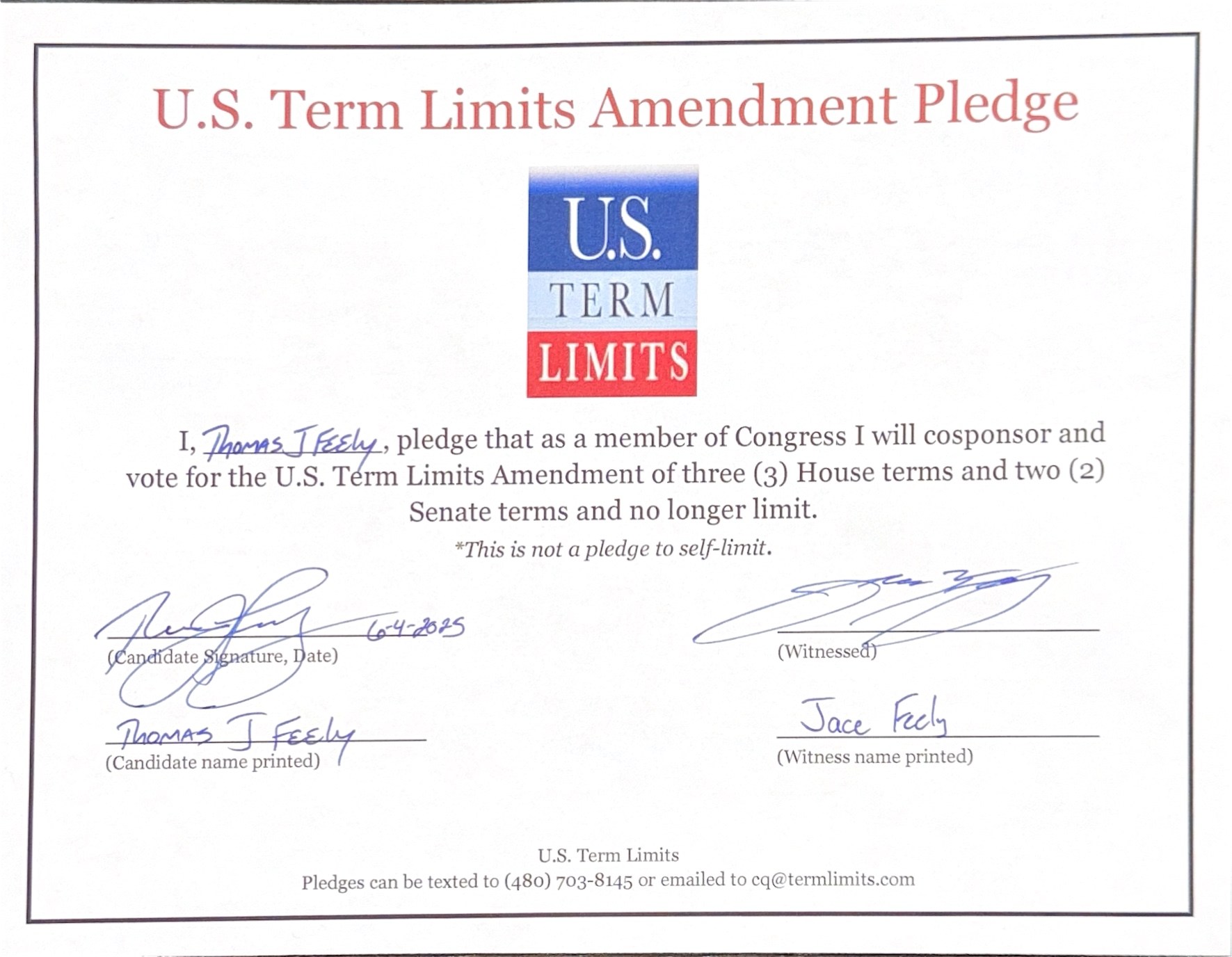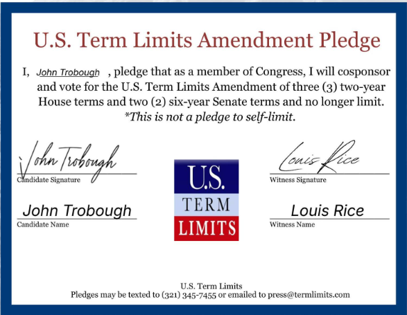 The U.S. Term Limits amendment pledge is provided to every announced candidate for federal office. It reads, “I pledge that as a member of Congress, I will cosponsor and vote for the U.S. Term Limits amendment of three (3) two-year House terms and two (2) six-year Senate terms and no longer limit.”