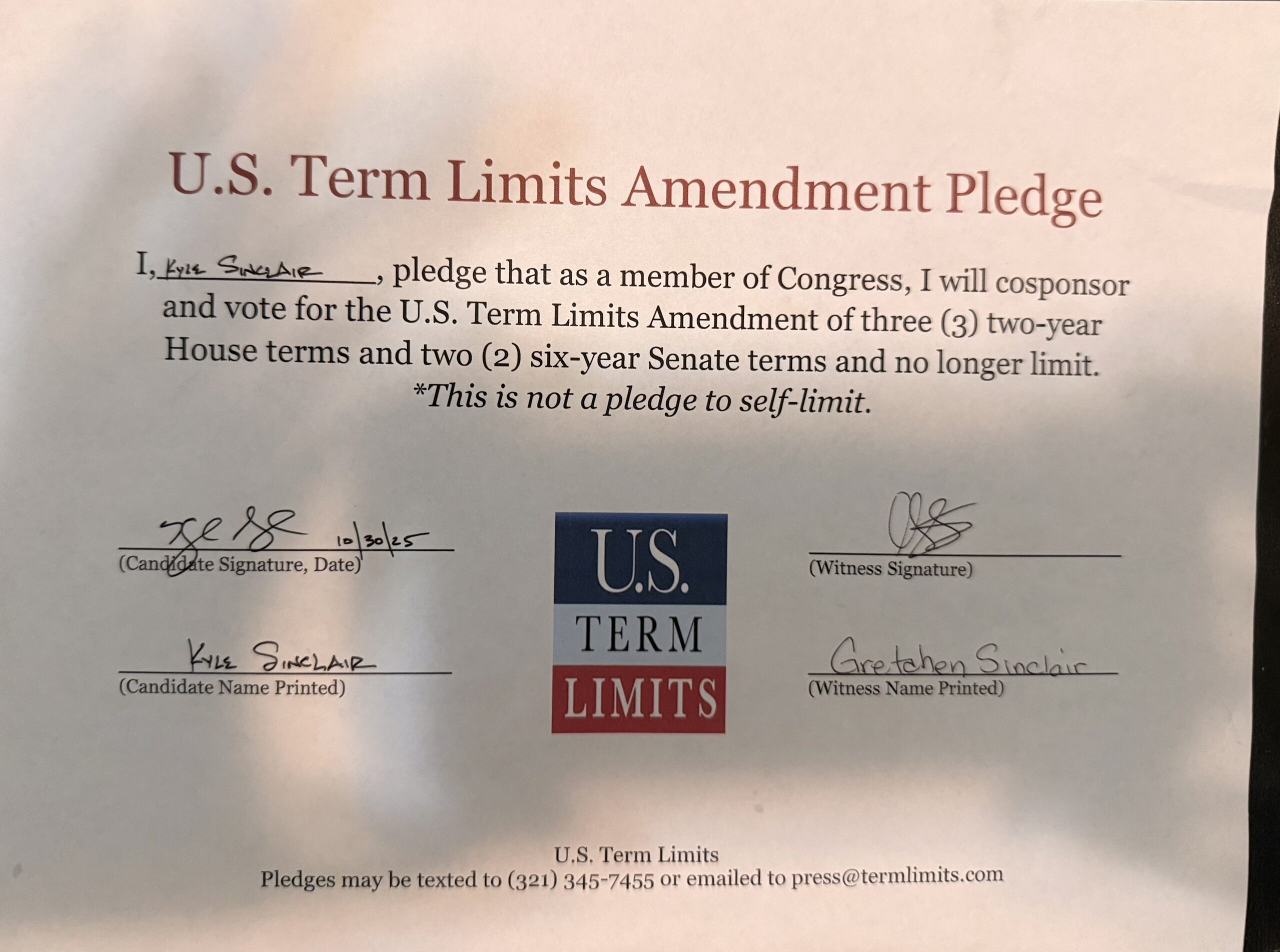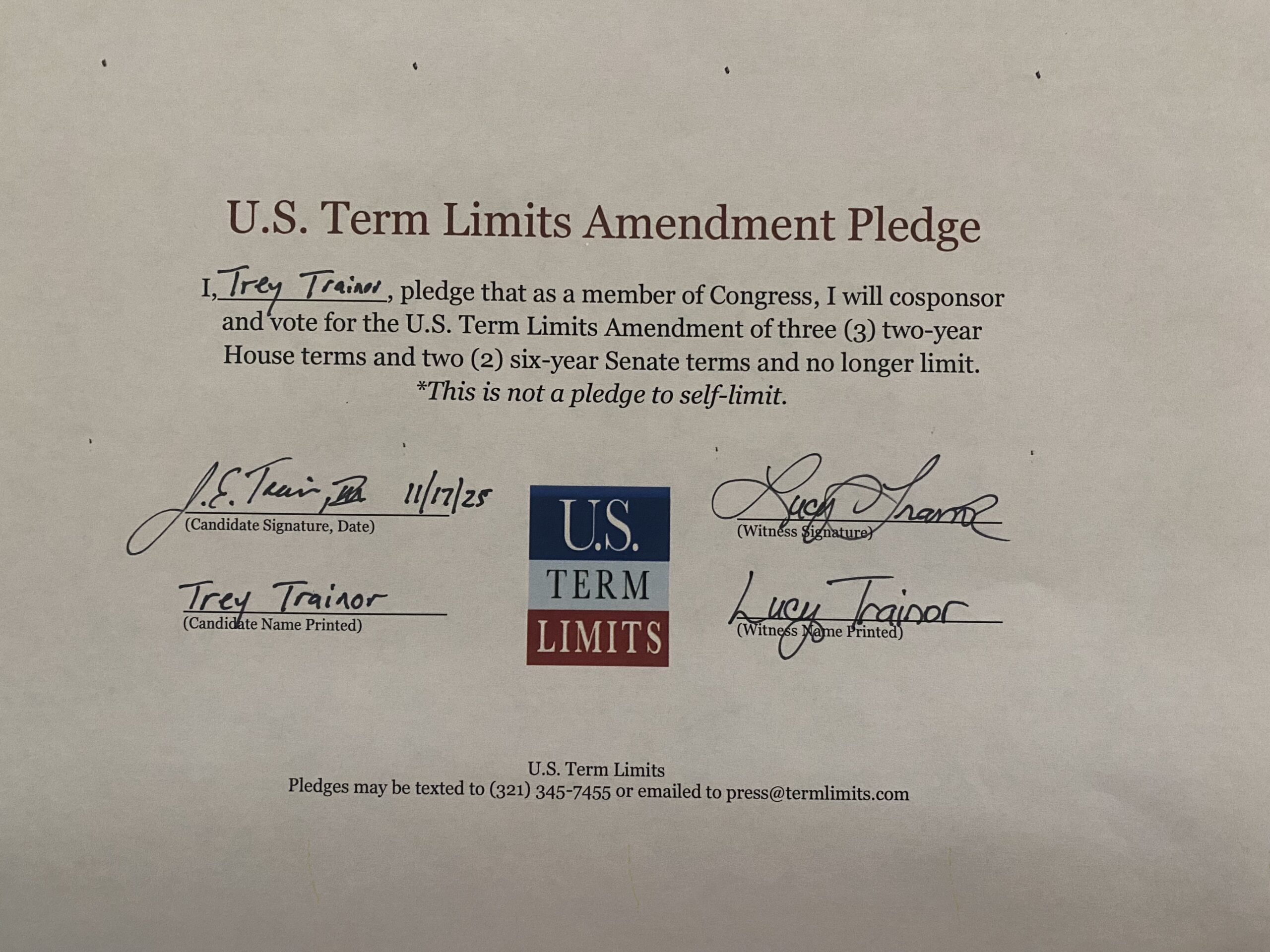 The U.S. Term Limits amendment pledge is provided to every announced candidate for federal office. It reads, “I pledge that as a member of Congress, I will cosponsor and vote for the U.S. Term Limits amendment of three (3) two-year House terms and two (2) six-year Senate terms and no longer limit.”