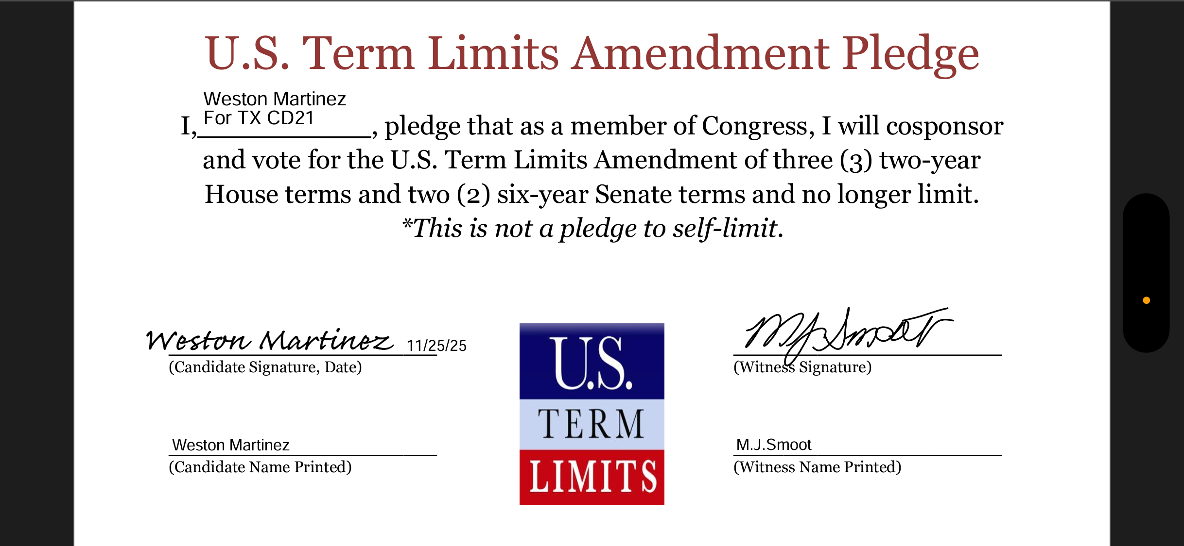 Washington D.C. – U.S. Term Limits (USTL), the leader in the non-partisan national movement to limit terms for elected officials, praises 2026 U.S. House of Representatives candidate for Texas, Weston Martinez (district 21), for signing the pledge for an amendment to term limit Congress. Previously, candidates Matt Okerson, Trey Trainor, Kyle Sinclair, Paul Rojas, Mark Teixeira, Daniel Betts, and Zeke Enriquez also signed the pledge.