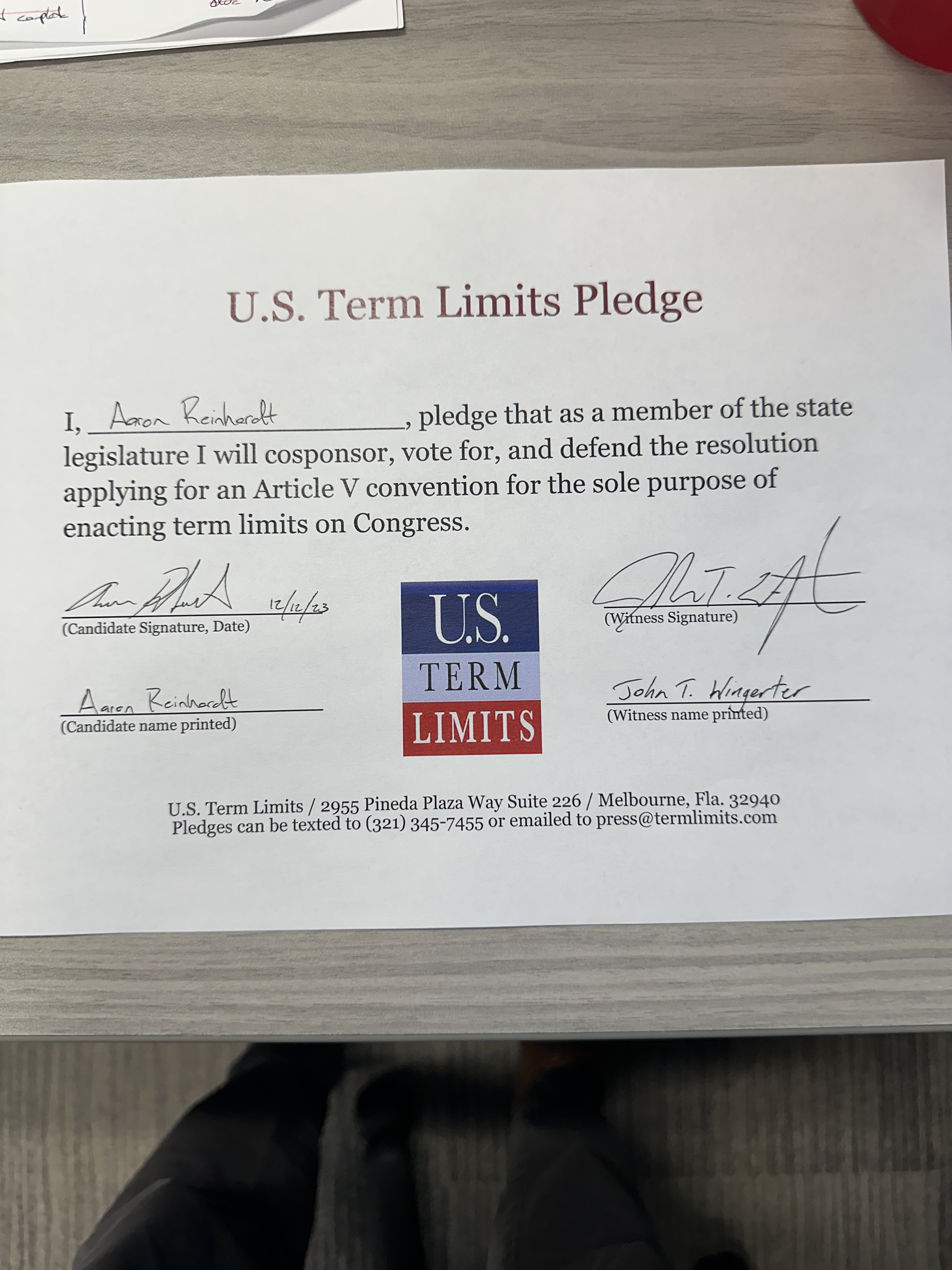 Aaron Reinhardt Pledges to Support Congressional Term Limits