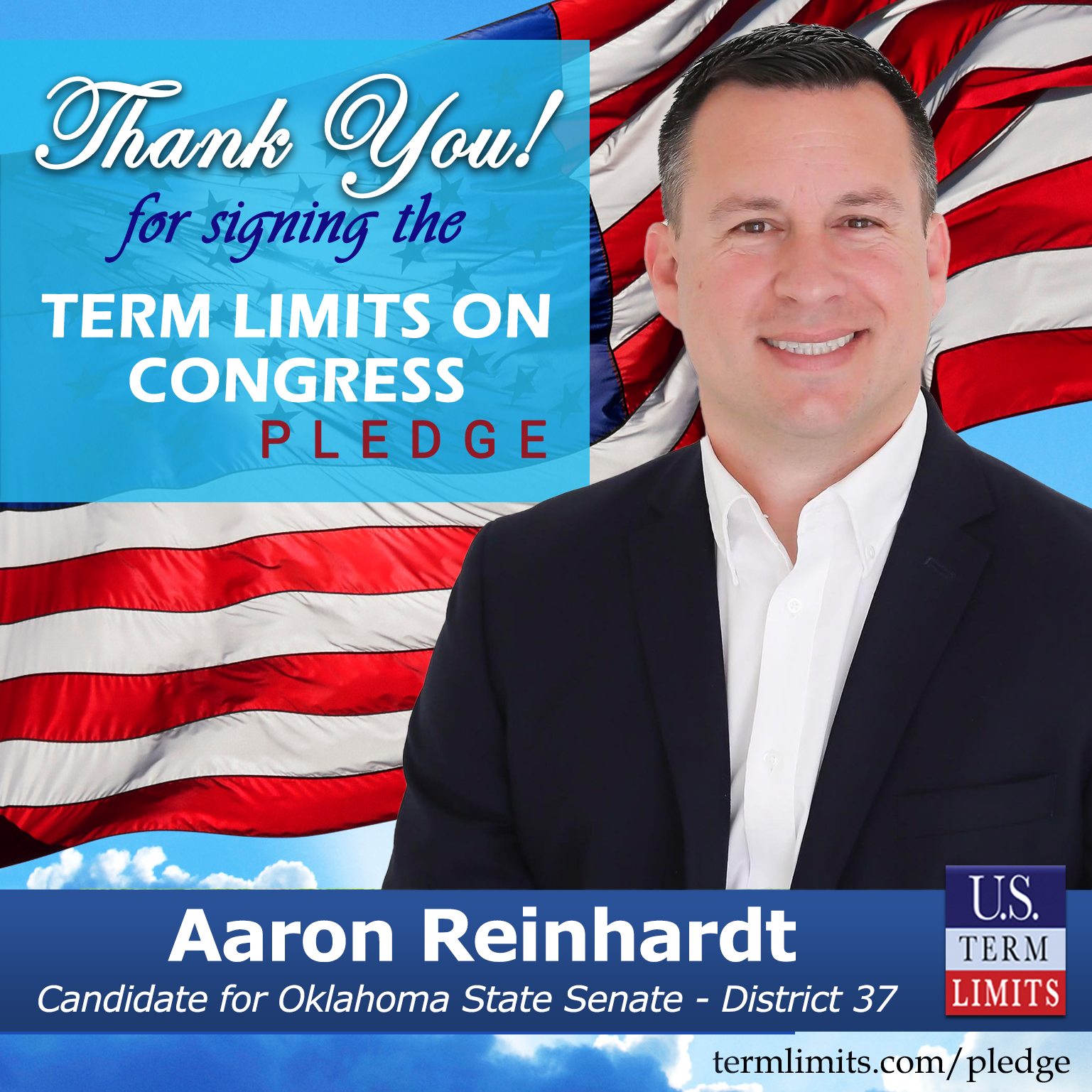 Tulsa, OK – U.S. Term Limits (USTL), the leader in the national, non-partisan movement to limit terms for elected officials, is gathering support from state lawmakers across the nation. Its mission is to get 34 states to apply for an amendment proposal convention specific to term limits on Congress. Oklahoma state senate candidate, Aaron Reinhardt (District 37), has committed support for term limits on Congress by signing the term limits convention pledge. Reinhardt is the first signer in this race.