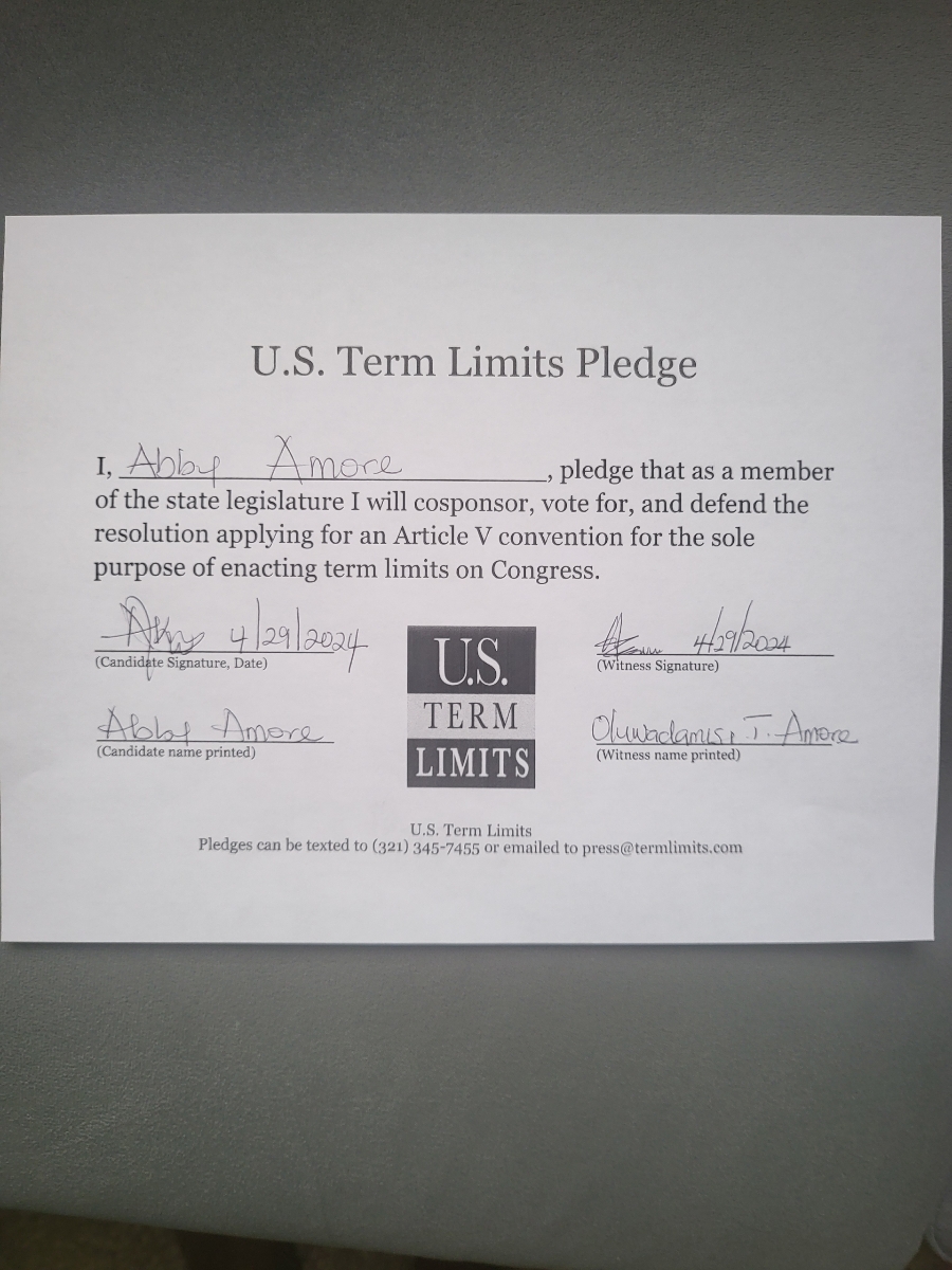 Douglasville, GA – U.S. Term Limits (USTL), the leader in the national, non-partisan movement to limit terms for elected officials, is gathering support from state lawmakers across the nation. Its mission is to get 34 states to apply for an amendment proposal convention specific to term limits on Congress. Georgia state house candidate, Abby Amore (District 40), has committed support for term limits on Congress by signing the term limits convention pledge. Amore is the first signer in this race.