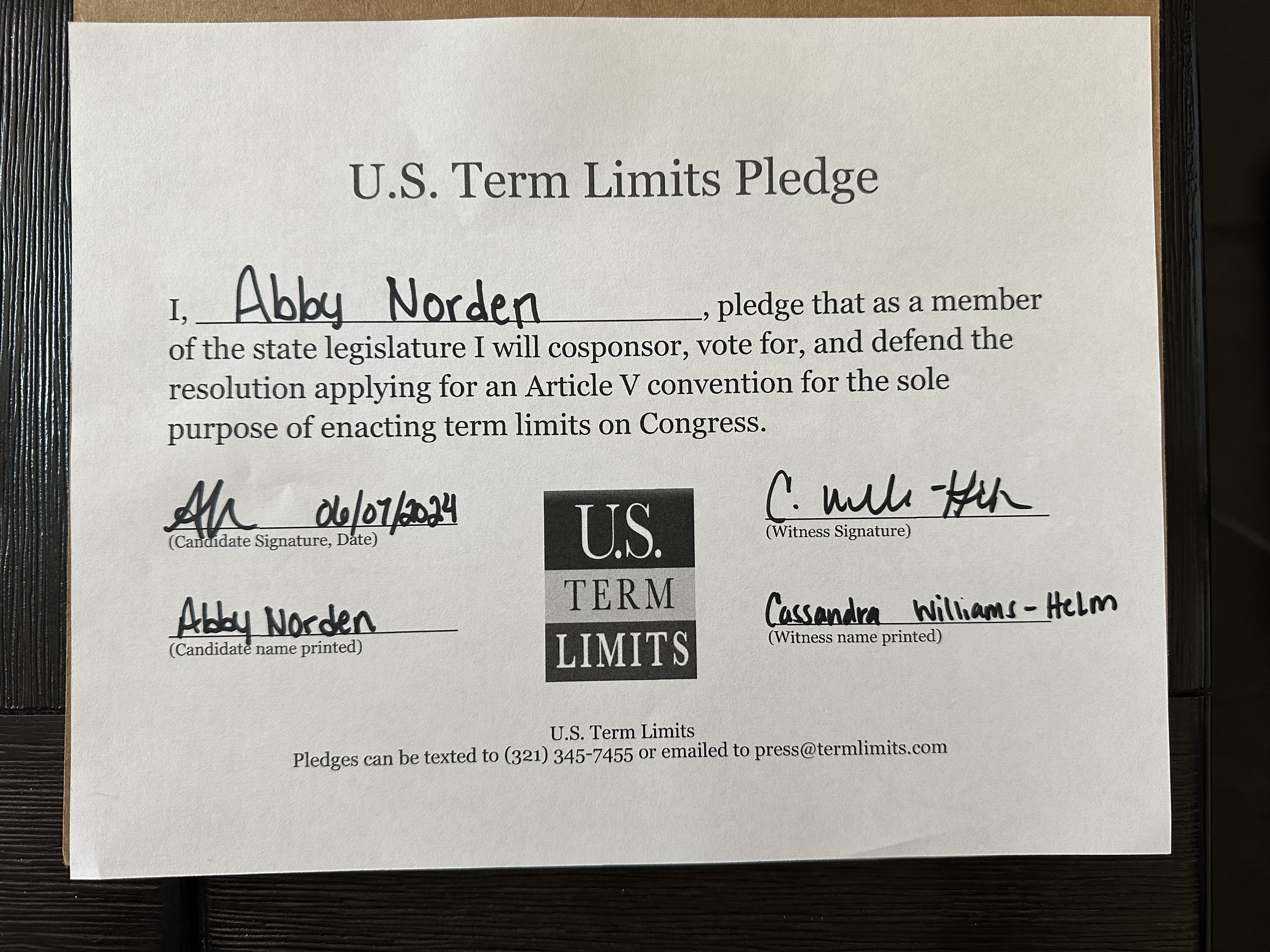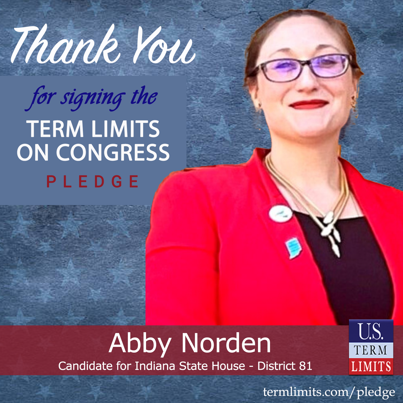 Huntertown, IN – U.S. Term Limits (USTL), the leader in the national, non-partisan movement to limit terms for elected officials, is gathering support from state lawmakers across the nation. Its mission is to get 34 states to apply for an amendment proposal convention specific to term limits on Congress. Indiana state house candidate, Abby Norden (District 81), has committed support for term limits on Congress by signing the Term Limits Convention Pledge. Previously, incumbent Rep. Martin Carbaugh also signed the pledge.