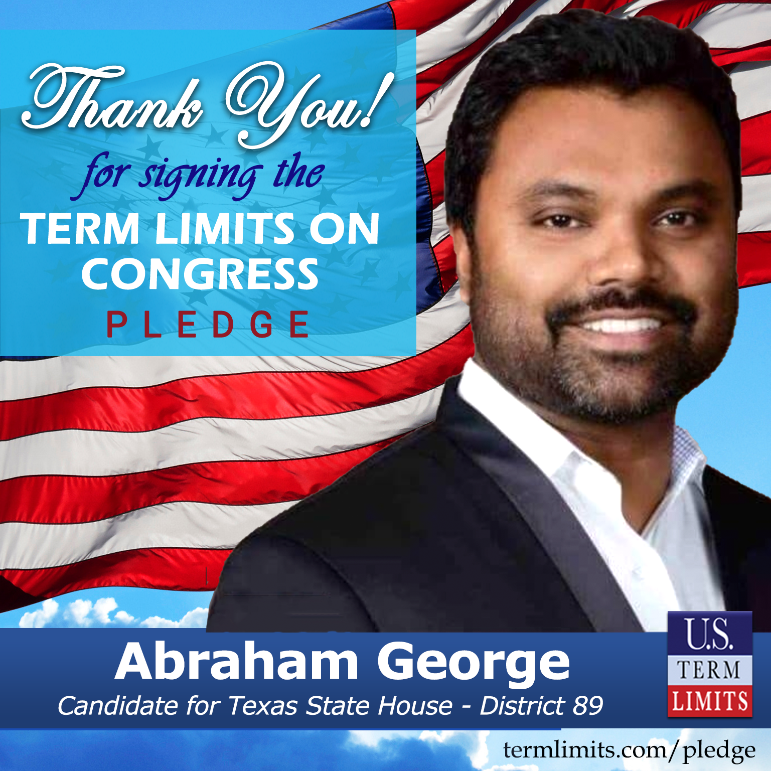 USTL President, Philip Blumel, commented on George’s pledge saying, “Abraham’s strong support of term limits shows that there are individuals who are willing to listen to the majority of voters who want term limits. America needs a Congress that will be served by citizen legislators, not career politicians.”