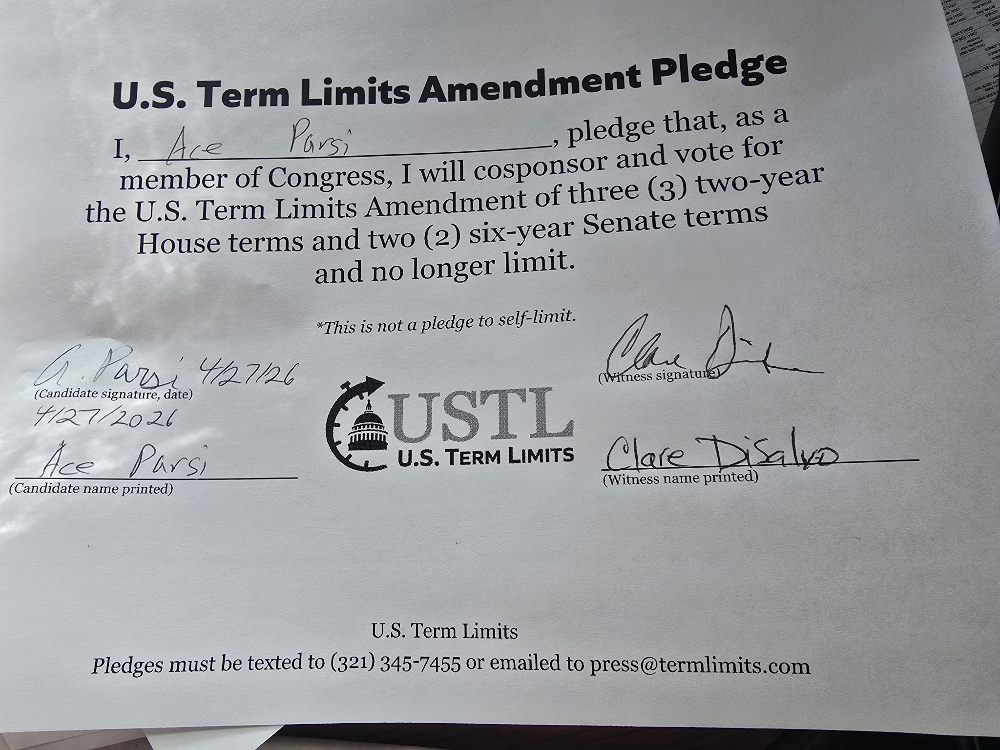 Washington D.C. – U.S. Term Limits (USTL), the leader in the non-partisan national movement to limit terms for elected officials, praises 2022 U.S. house candidate for West Virginia, Ace Parsi (district 2), for signing the pledge for an amendment to term limit Congress. Previously, Rep. Riley Moore also signed.