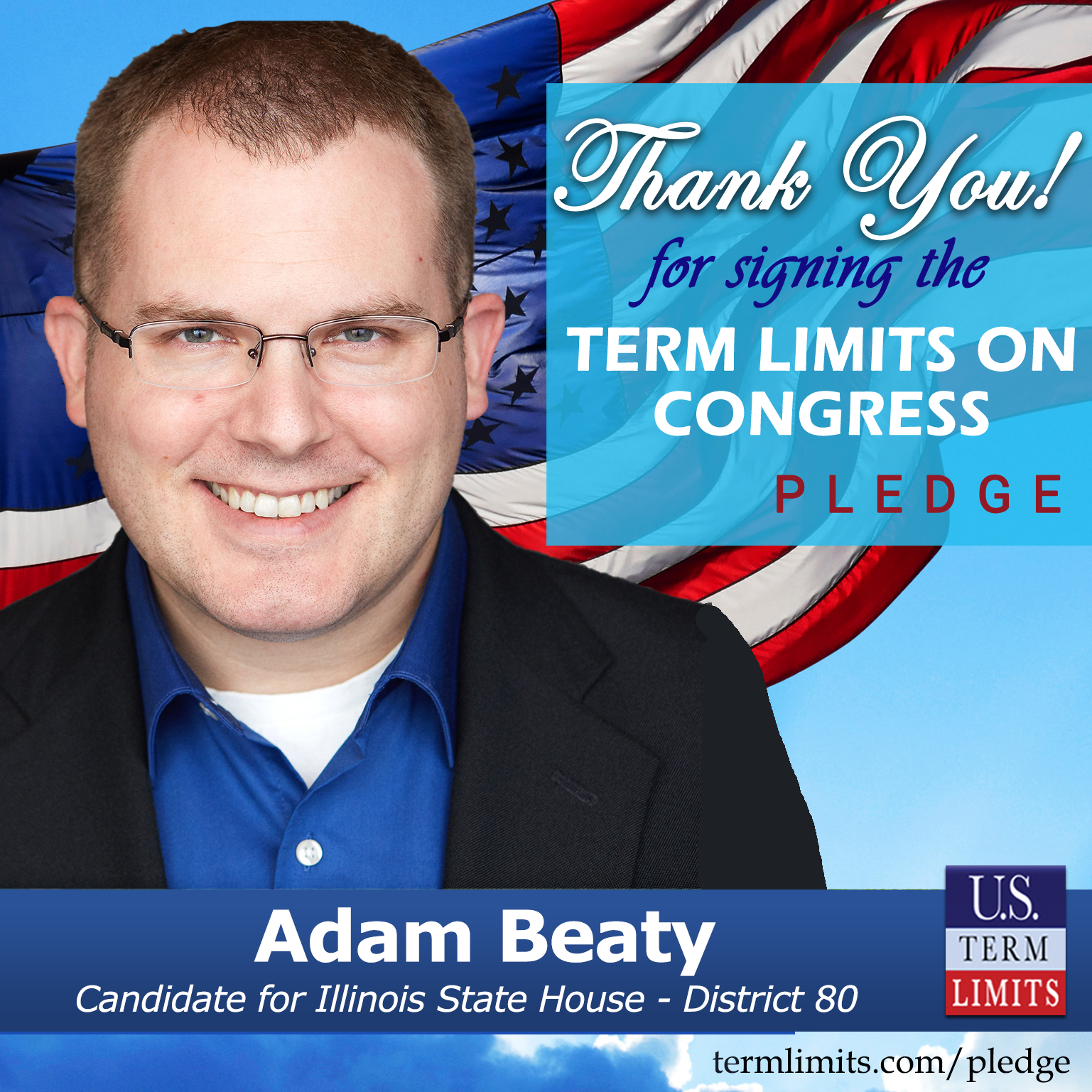 Chicago Heights, IL – U.S. Term Limits (USTL), the leader in the national, non-partisan movement to limit terms for elected officials, is gathering support from state lawmakers across the nation. Its mission is to get 34 states to apply for an amendment proposal convention specific to term limits on Congress. Illinois state house candidate, Adam Beaty (District 80), has committed support for term limits on Congress by signing the term limits convention pledge. Beaty is the first signer in this race.