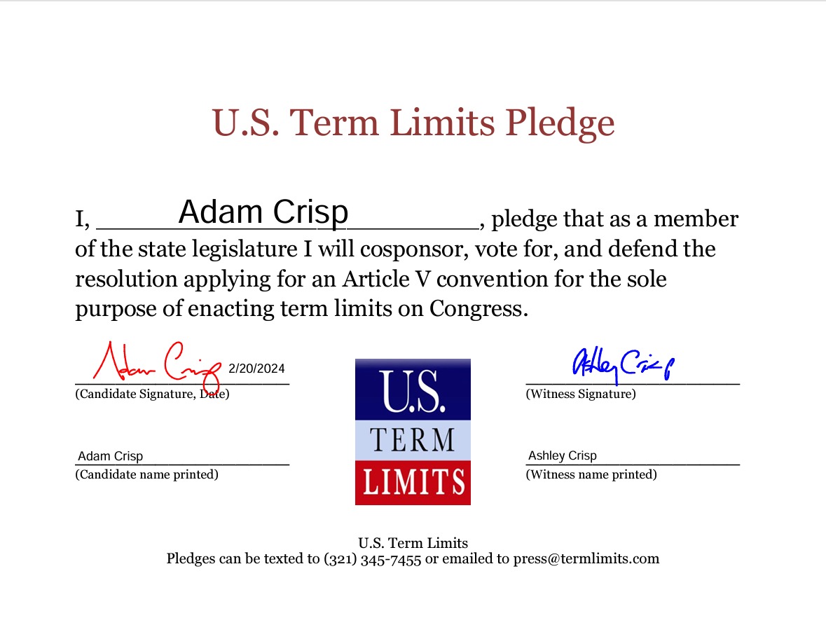 USTL President, Philip Blumel, commented on Crisp’s pledge saying, “Adam’s strong support of term limits shows that there are individuals who are willing to listen to the majority of voters who want term limits. America needs a Congress that will be served by citizen legislators, not career politicians.”