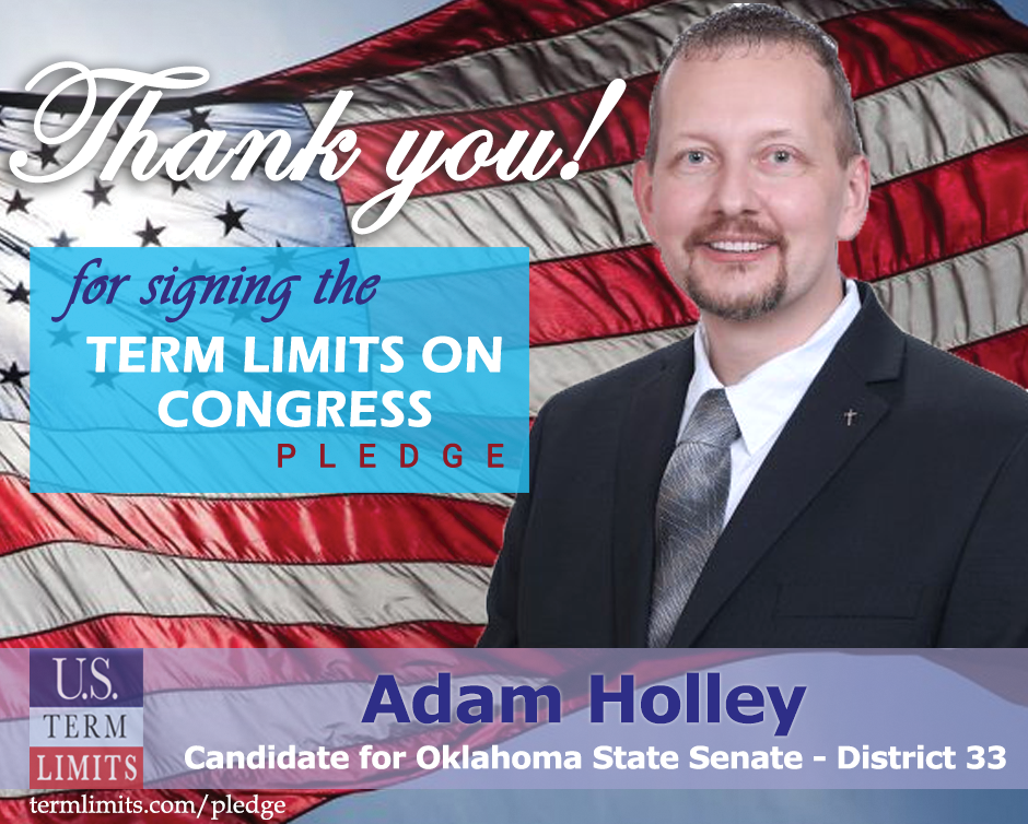 Oklahoma City, OK – U.S. Term Limits (USTL), the leader in the national, non-partisan movement to limit terms for elected officials, is gathering support from state lawmakers across the nation. Its mission is to get 34 states to apply for an amendment proposal convention specific to term limits on Congress. Oklahoma’s state senate candidate, Adam Holley (district 33), has committed support for term limits on Congress by signing the U.S. Term Limits pledge. Holley is the first signer in this race.