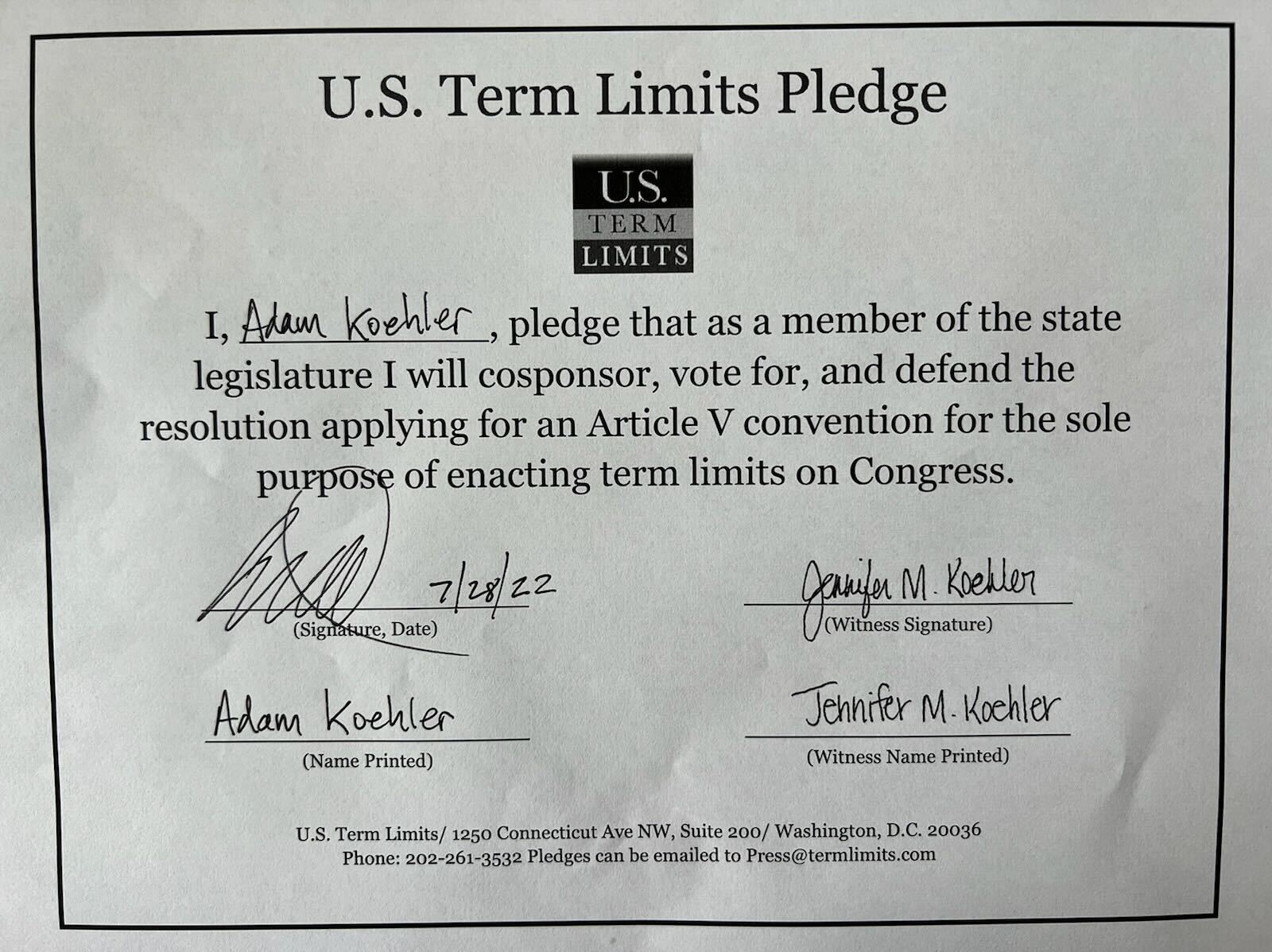 USTL President, Philip Blumel, commented on Koehler’s pledge saying, “Adam’s support of term limits shows that there are individuals who are willing to listen to the majority of voters who want term limits. America needs a Congress that will be served by citizen legislators, not career politicians.”