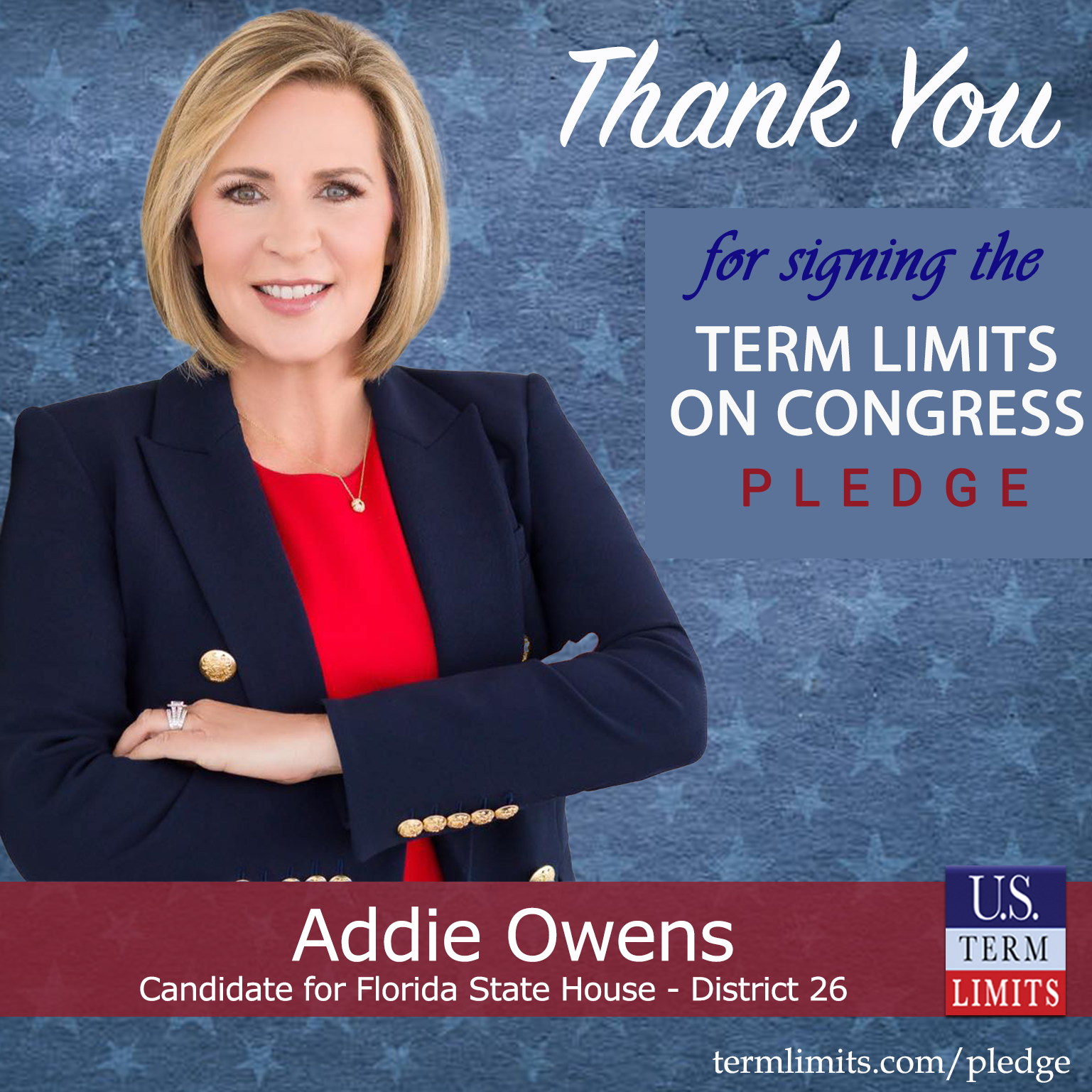 Leesburg, FL – U.S. Term Limits (USTL), the leader in the national, non-partisan movement to limit terms for elected officials, is gathering support from state lawmakers across the nation. Its mission is to get 34 states to apply for an amendment proposal convention specific to term limits on Congress. Florida state house candidate, Addie Owens (district 26), has committed support for term limits on Congress by signing the term limits convention pledge. She is the first signer in this race.