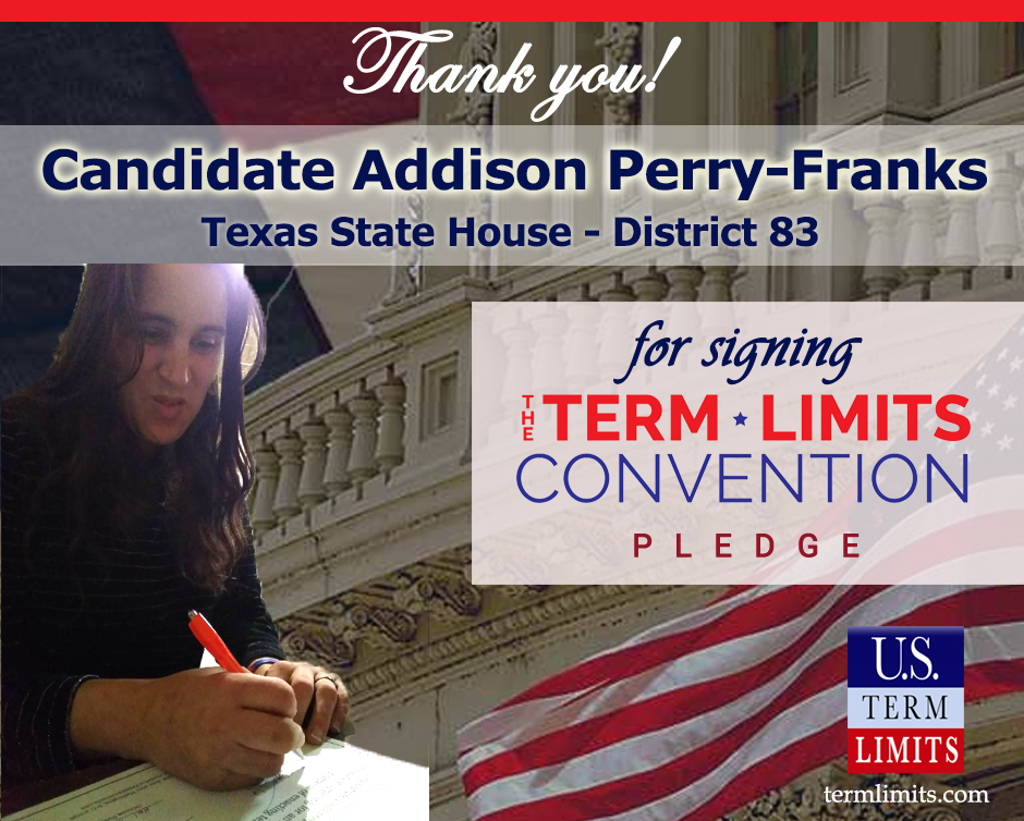Washington, D.C. – U.S. Term Limits (USTL), the leader in the national, non-partisan movement to limit terms for elected officials, is gathering support from state lawmakers across the nation. Its mission is to get 34 states to apply for an amendment proposal convention specific to term limits on Congress. 2020 Texas state house candidate, Addison Perry-Franks, (district 83), has committed support for term limits on Congress by signing the Term Limits Convention pledge. The primary election is scheduled for March 3, 2020.