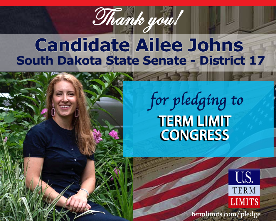 Washington, D.C. – U.S. Term Limits (USTL), the leader in the national, non-partisan movement to limit terms for elected officials, is gathering support from state lawmakers across the nation. Its mission is to get 34 states to apply for an amendment proposal convention specific to term limits on Congress. South Dakota state senate candidate, Ailee Johns (district 17), has committed support for term limits on Congress by signing the Term Limits Convention pledge. Johns is the first signer in this race.