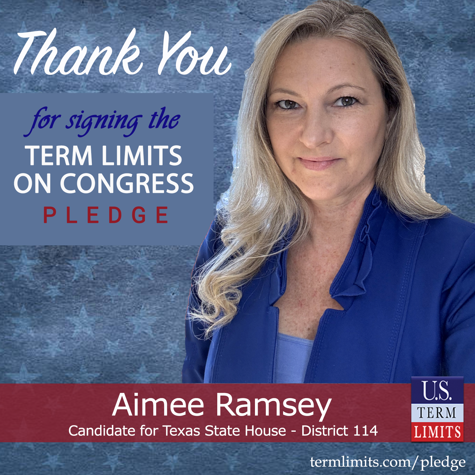 State Chair for U.S. Term Limits, Brandon Herrera, commented on Ramsey’s pledge saying, “Term limits will restore our founding fathers’ vision of a citizen legislature. I am so glad Aimee recognizes the need for term limits and has signed our pledge. I know that Texas voters will be impressed with her support for term limits.”