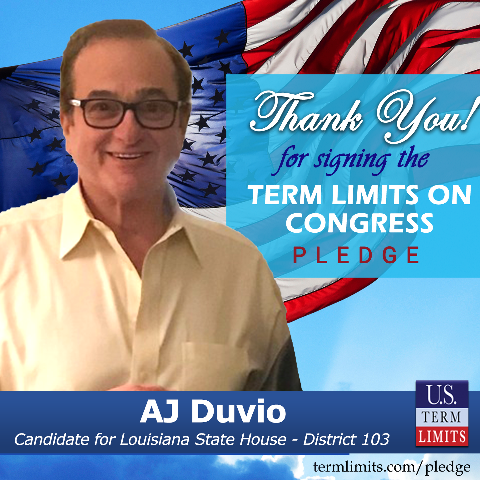 New Orleans, LA – U.S. Term Limits (USTL), the leader in the national, non-partisan movement to limit terms for elected officials, is gathering support from state lawmakers across the nation. Its mission is to get 34 states to apply for an amendment proposal convention specific to term limits on Congress. Louisiana state house candidate, AJ Duvio (District 103), has committed support for term limits on Congress by signing the term limits convention pledge. Previously, candidates Richard Lewis and Mike Bayham also signed the pledge in this race.