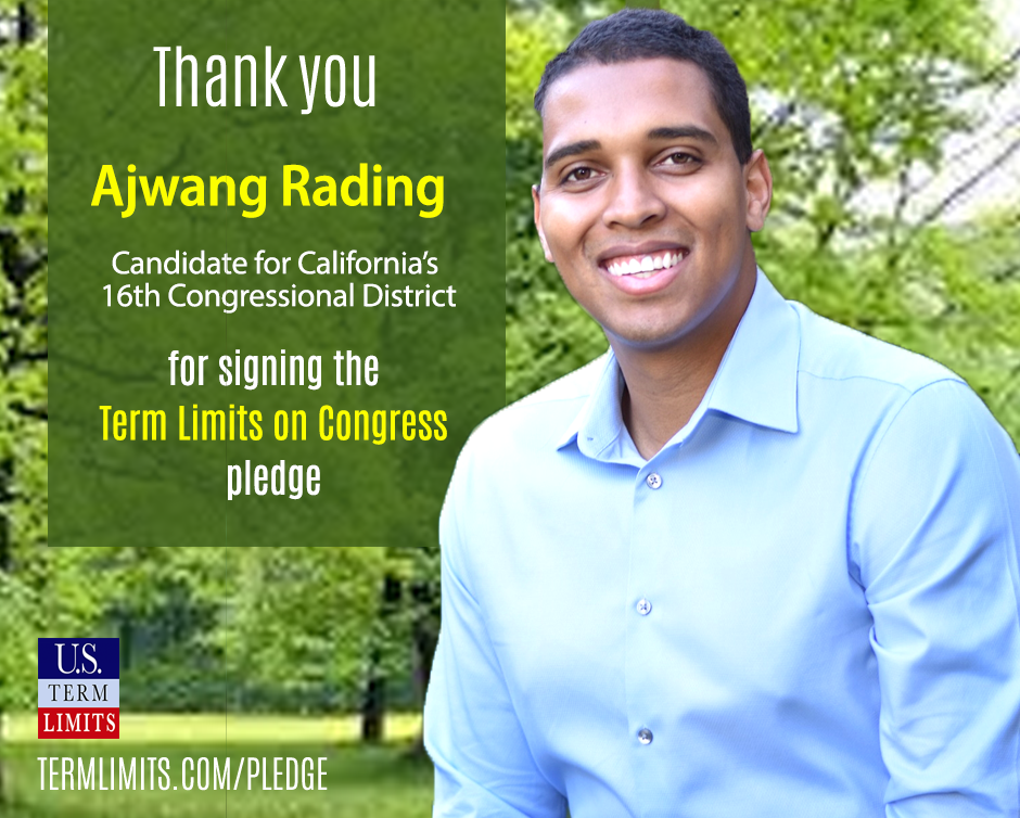 Washington D.C. – U.S. Term Limits (USTL), the leader in the non-partisan national movement to limit terms for elected officials, praises 2022 U.S. house candidate for California, Ajwang Rading (district 16), for signing the pledge for an amendment to term limit Congress. Previously, candidate Benjamin Solomon also signed the pledge.