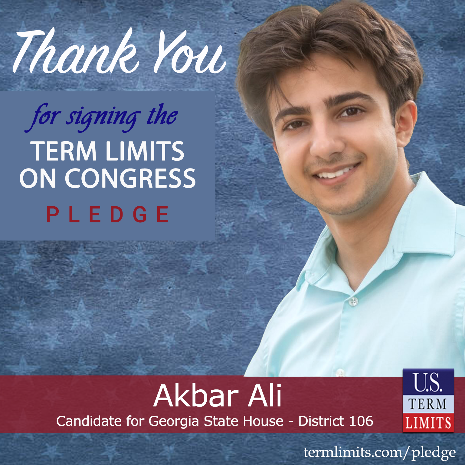 Snellville, GA – U.S. Term Limits (USTL), the leader in the national, non-partisan movement to limit terms for elected officials, is gathering support from state lawmakers across the nation. Its mission is to get 34 states to apply for an amendment proposal convention specific to term limits on Congress. 2026 Georgia state house candidate, Akbar Ali (district 106), has committed support for term limits on Congress by signing the term limits convention pledge.
