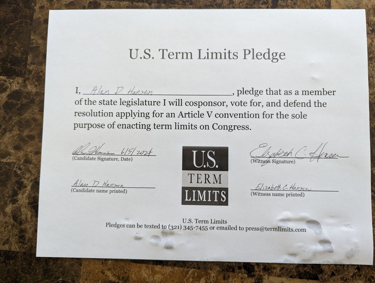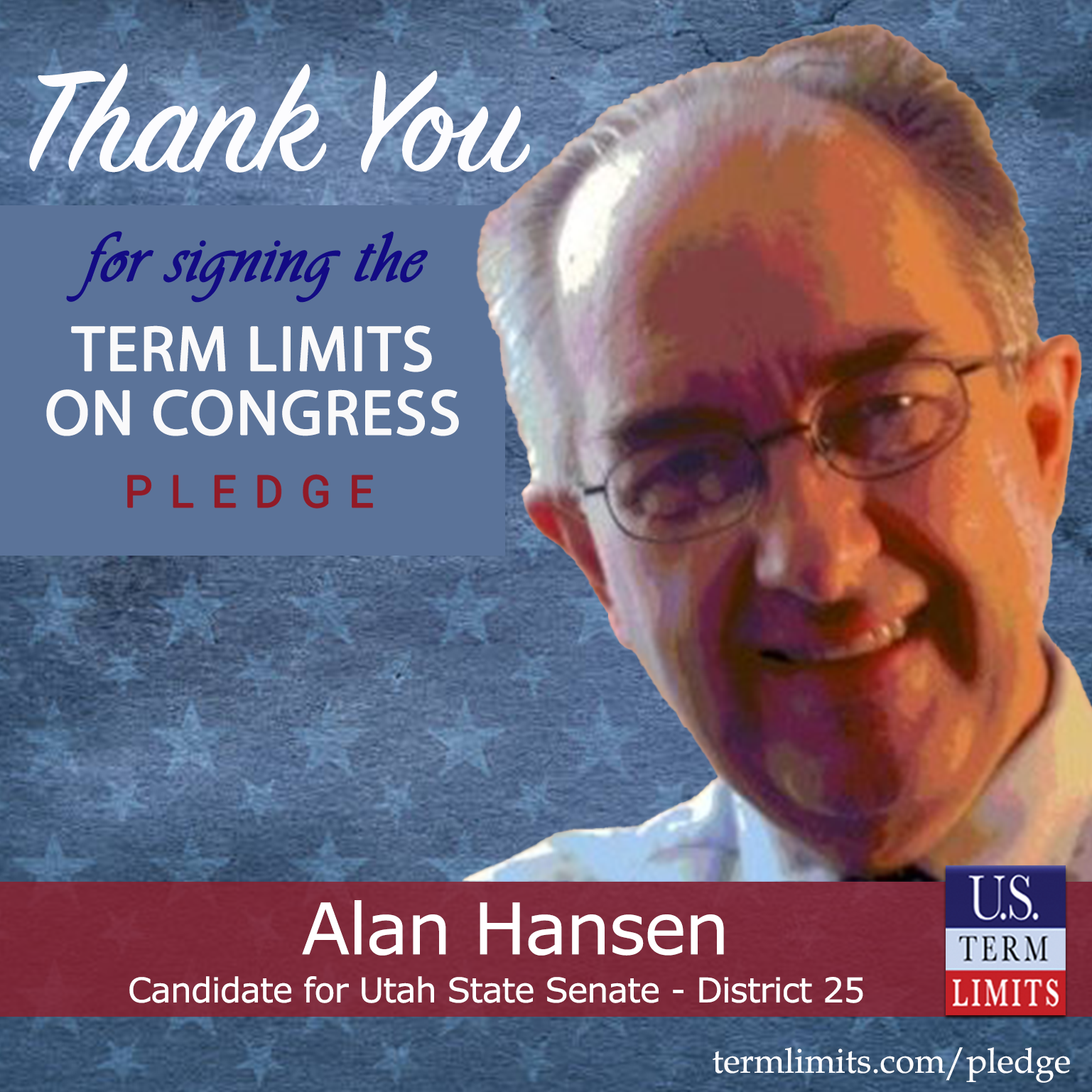 Provo, UT – U.S. Term Limits (USTL), the leader in the national, non-partisan movement to limit terms for elected officials, is gathering support from state lawmakers across the nation. Its mission is to get 34 states to apply for an amendment proposal convention specific to term limits on Congress. Utah state senate candidate, Alan Hansen (District 25), has committed support for term limits on Congress by signing the Term Limits Convention Pledge.