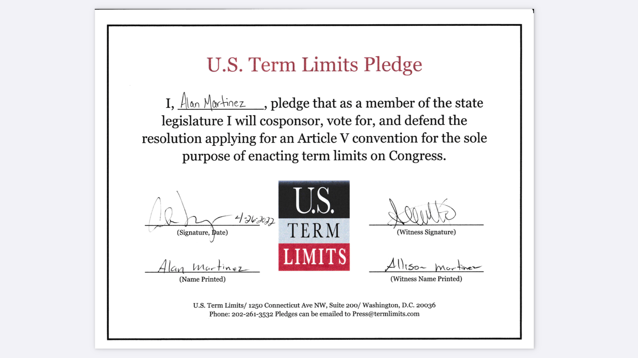 USTL President, Philip Blumel, commented on Martinez’s pledge saying, “Alan’s support of term limits shows that there are individuals who are willing to listen to the majority of voters who want term limits. America needs a Congress that will be served by citizen legislators, not career politicians.”