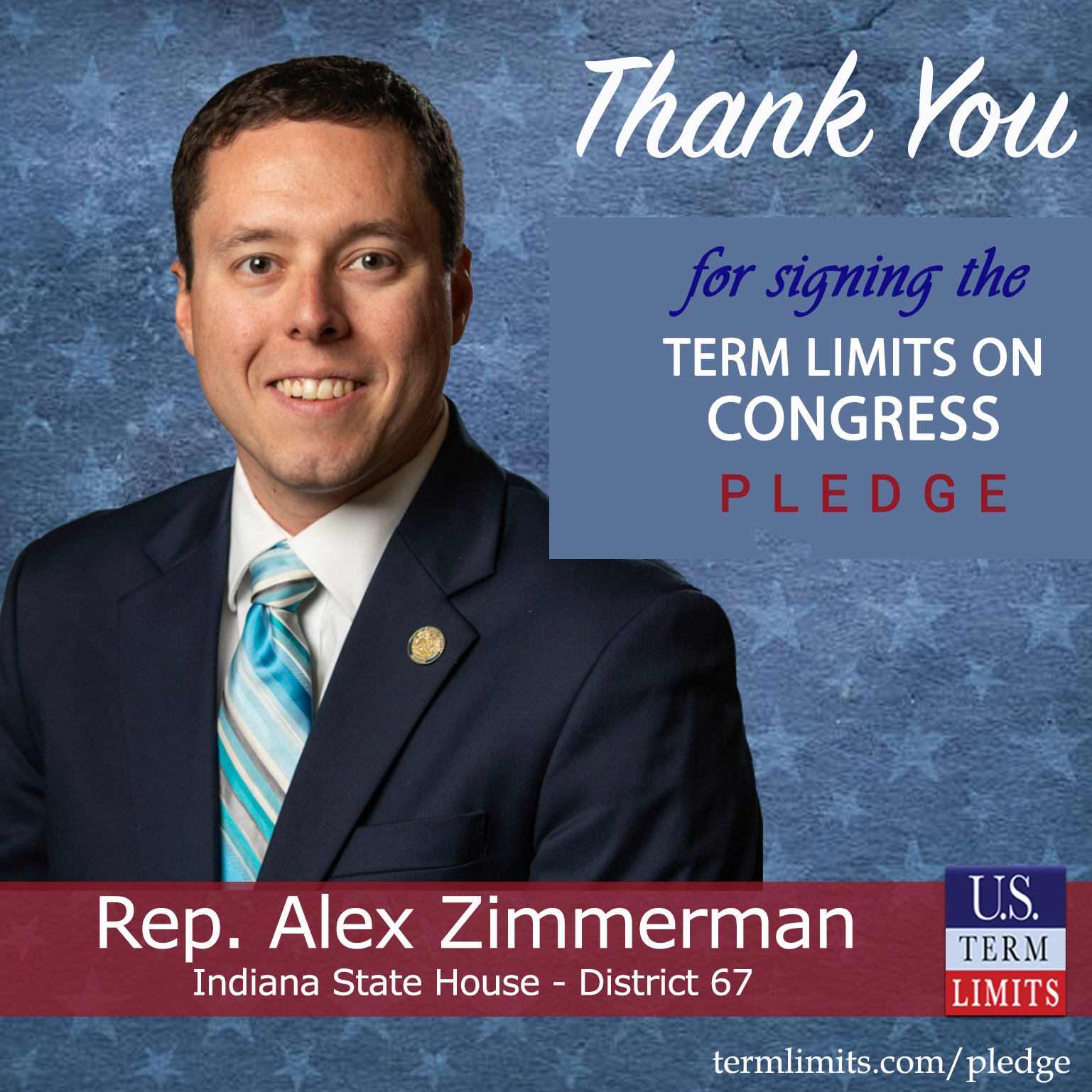 Indianapolis, IN – U.S. Term Limits (USTL), the leader in the national, non-partisan movement to limit terms for elected officials, is gathering support from state lawmakers across the nation. Its mission is to get 34 states to apply for an amendment proposal convention specific to term limits on Congress. Indianapolis state house Rep. Alex Zimmerman (District 67), has committed support for term limits on Congress by signing the term limits convention pledge.
