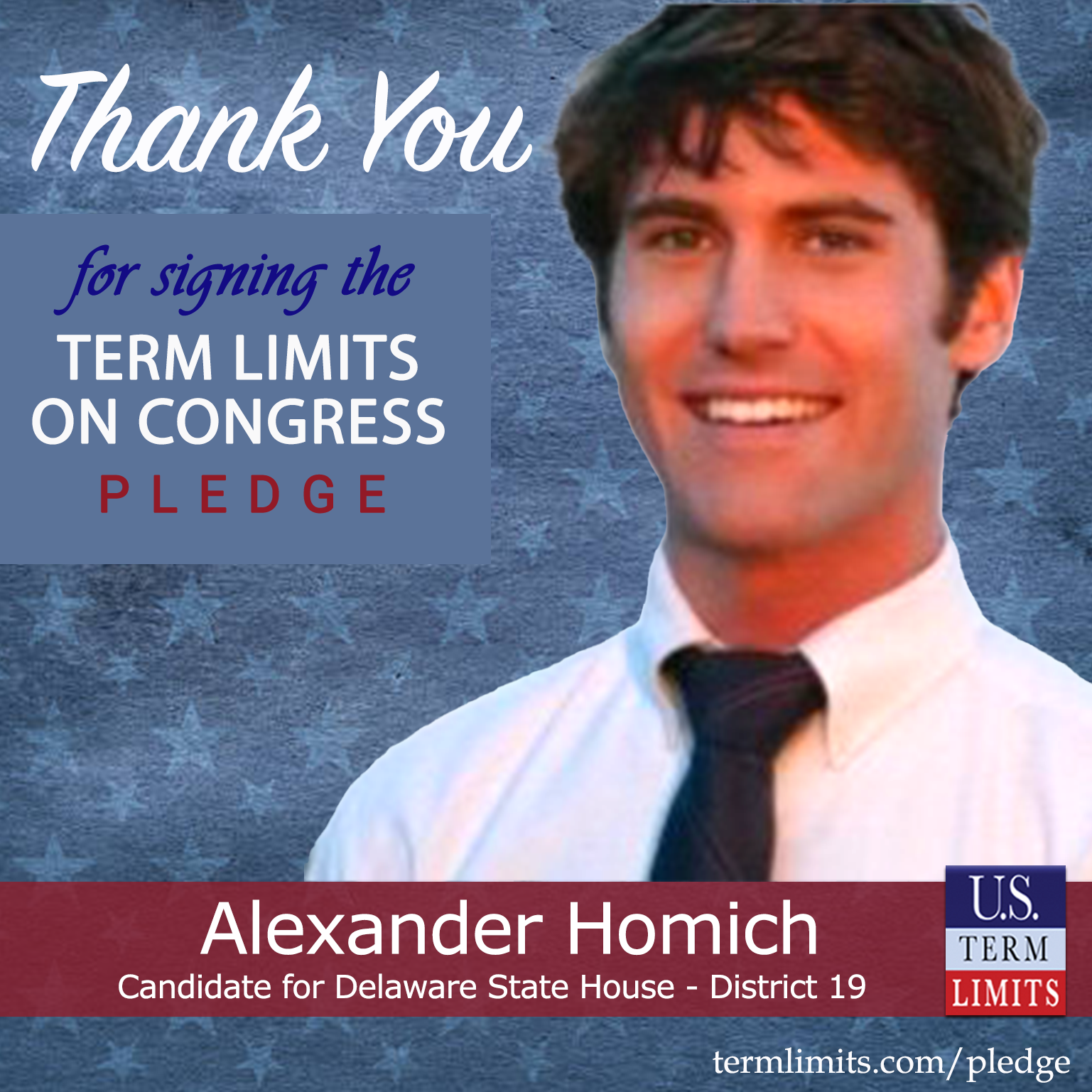 Dover, DE – U.S. Term Limits (USTL), the leader in the national, non-partisan movement to limit terms for elected officials, is gathering support from state lawmakers across the nation. Its mission is to get 34 states to apply for an amendment proposal convention specific to term limits on Congress. Delaware state house candidate, Alexander Homich (District 19), has committed support for term limits on Congress by signing the term limits convention pledge.