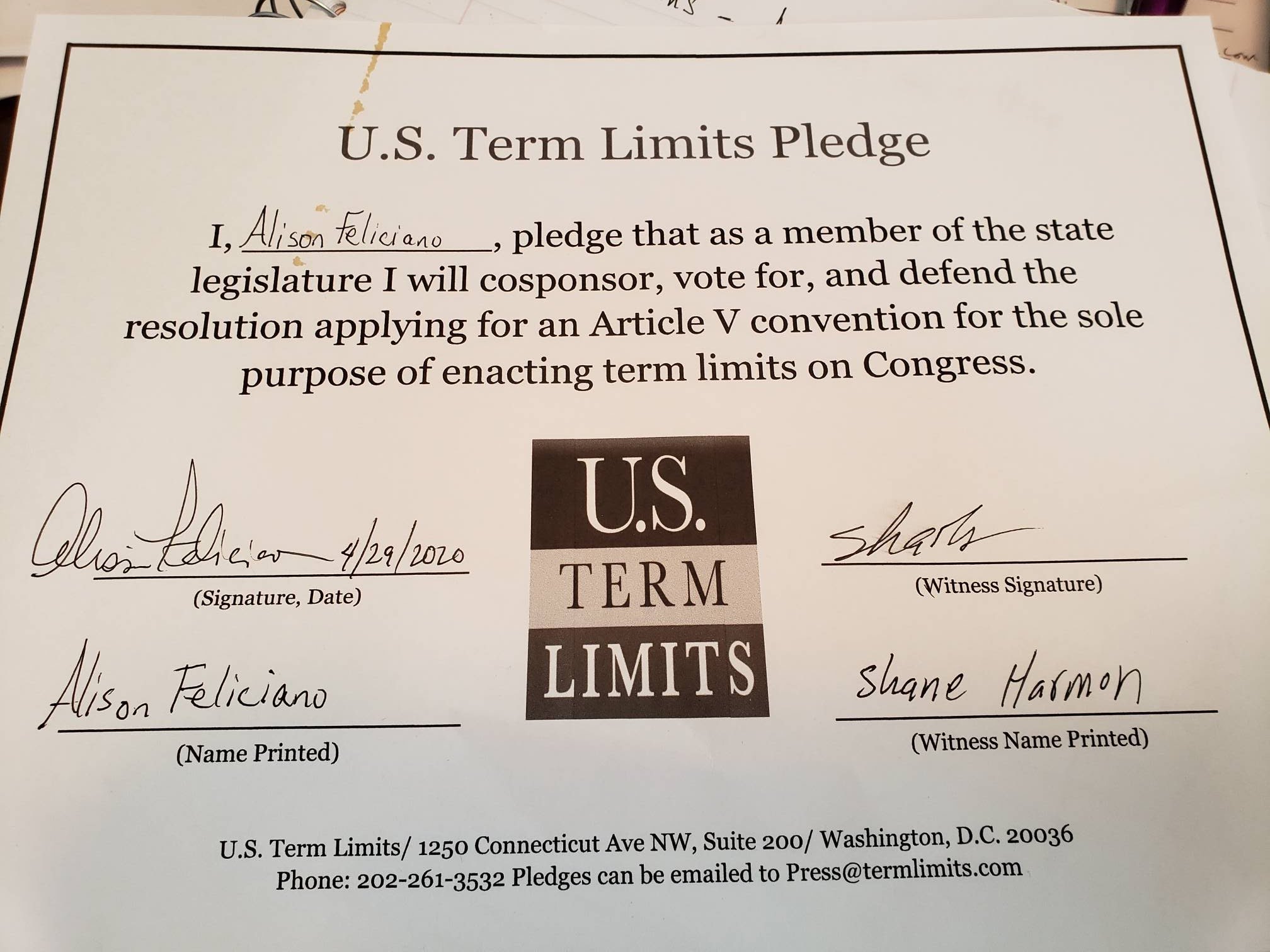 Alison Feliciano Pledges to Support Congressional Term Limits