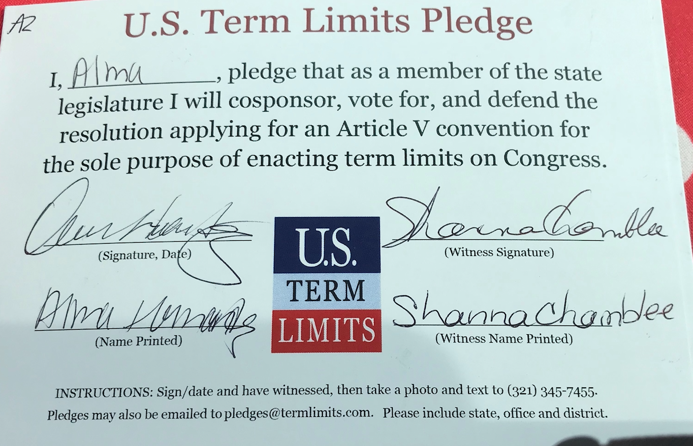 Washington, D.C. – U.S. Term Limits (USTL), the leader in the national, non-partisan movement to limit terms for elected officials, is gathering support from state lawmakers across the nation. Its mission is to get 34 states to apply for an amendment proposal convention specific to term limits on Congress. Arizona state Representative Alma Hernandez (district 03) has committed support for term limits on Congress by signing the Term Limits Convention pledge.