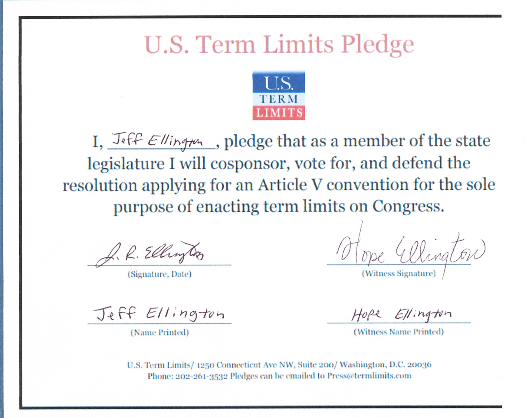 The U.S. Term Limits pledge is provided to candidates and members of state legislatures. It reads, “I pledge that, as a member of the state legislature, I will cosponsor, vote for, and defend the resolution applying for an Article V convention for the limited purpose of enacting term limits on Congress.”