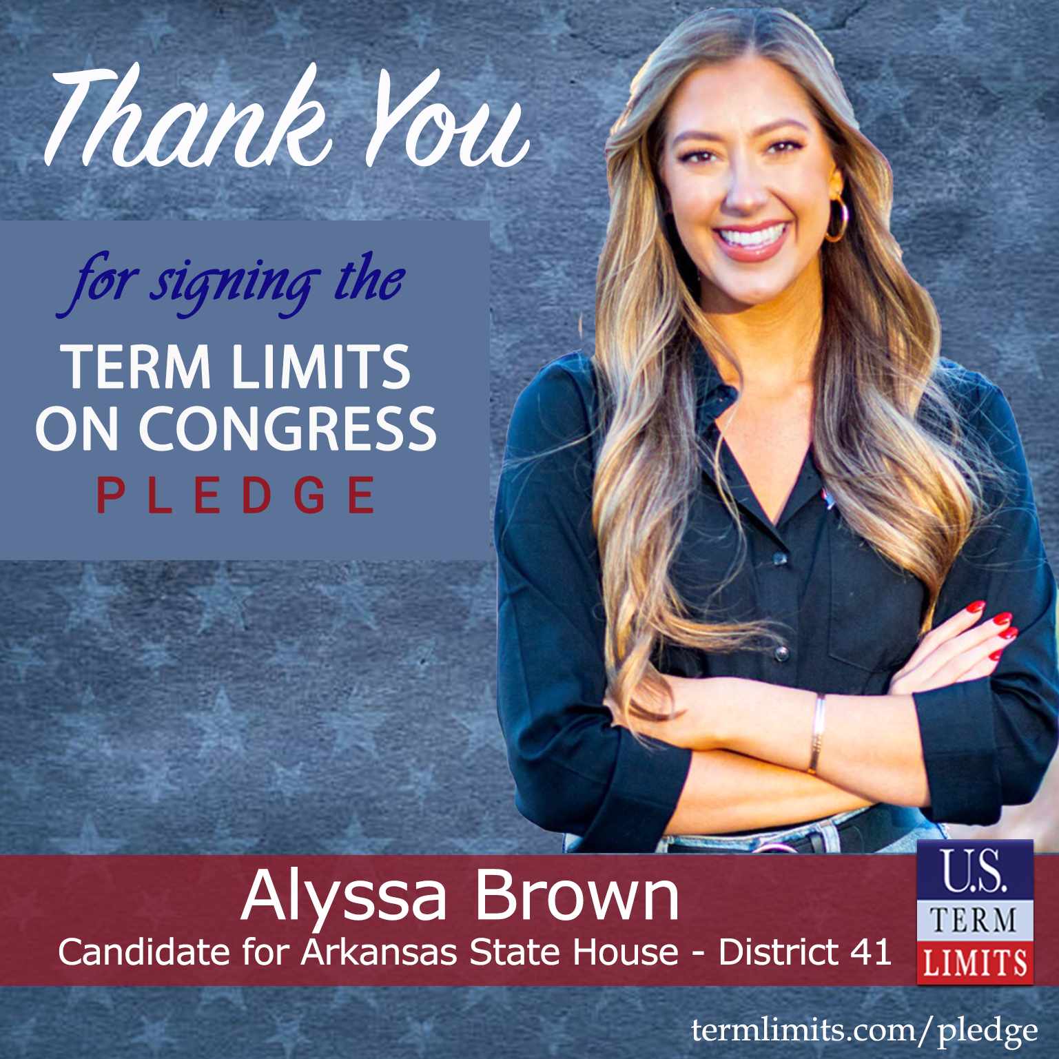 Heber Springs, AR – U.S. Term Limits (USTL), the leader in the national, non-partisan movement to limit terms for elected officials, is gathering support from state lawmakers across the nation. Its mission is to get 34 states to apply for an amendment proposal convention specific to term limits on Congress. Arkansas state house candidate, Alyssa Brown (District 41), has committed support for term limits on Congress by signing the term limits convention pledge. Brown is the first signer in this race.