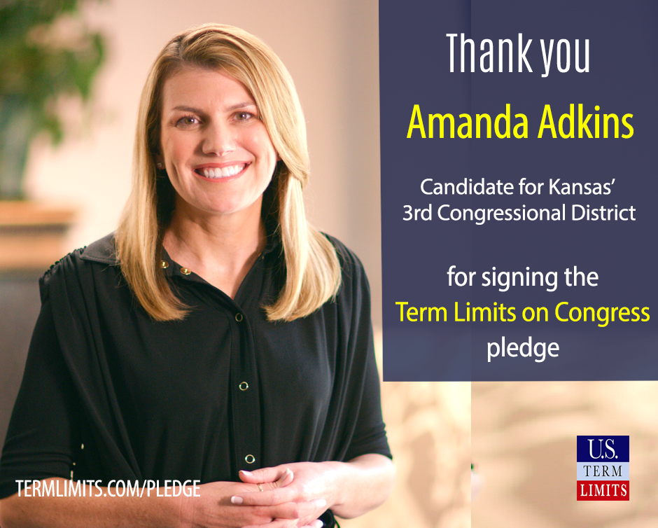 Washington, DC – U.S. Term Limits (USTL), the leader in the non-partisan national movement to limit terms for elected officials, praises 2020 U.S. house candidate for Kansas, Amanda Adkins (district 3) , for signing the pledge for an amendment to term limit Congress. Previously, candidates Adrienne Foster and Sara Hart Weir also signed the pledge. The primary election is scheduled for August 4 , 2020.