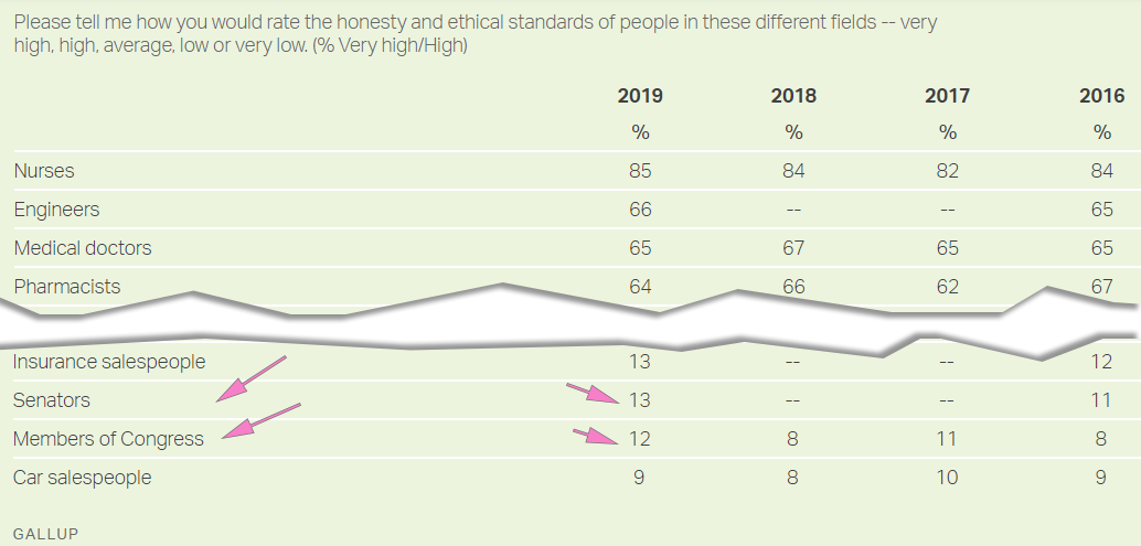 The headline of the latest Gallup poll, dated January 6, 2020, reads innocuously enough, “Nurses Continue to Rate Highest in Honesty, Ethics.” But what the headline doesn’t say is, if nurses rank the highest, who ranks the lowest?