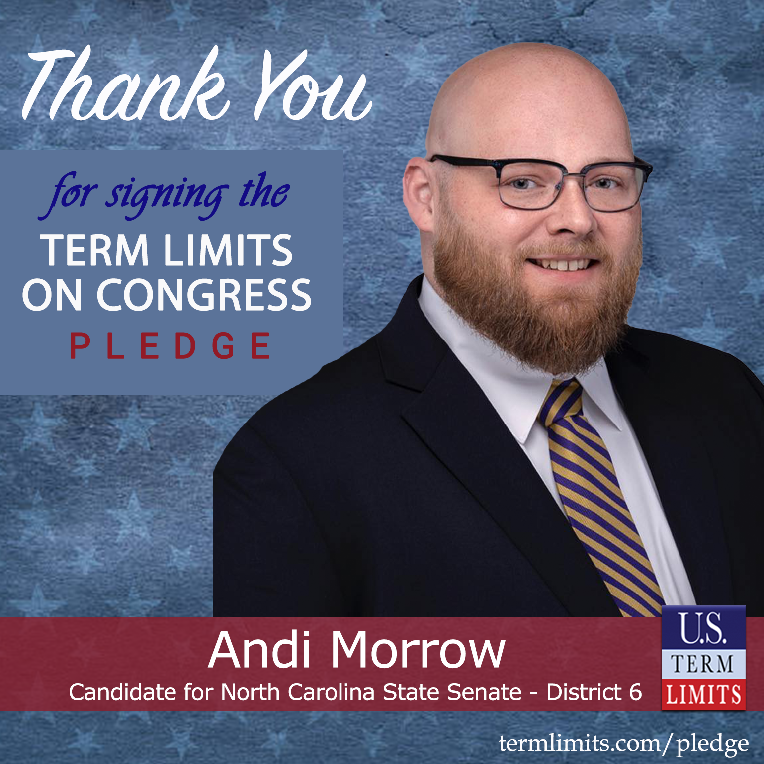 “I am so pleased that Andi Morrow is joining the call for term limits on Congress.  With Andi’s help, we will be able to pass the resolution in North Carolina joining the growing number of states and he has helped us take one more step forward in ending the stranglehold of career politicians,” said Leigh Brown, State Chair for U.S. Term Limits.