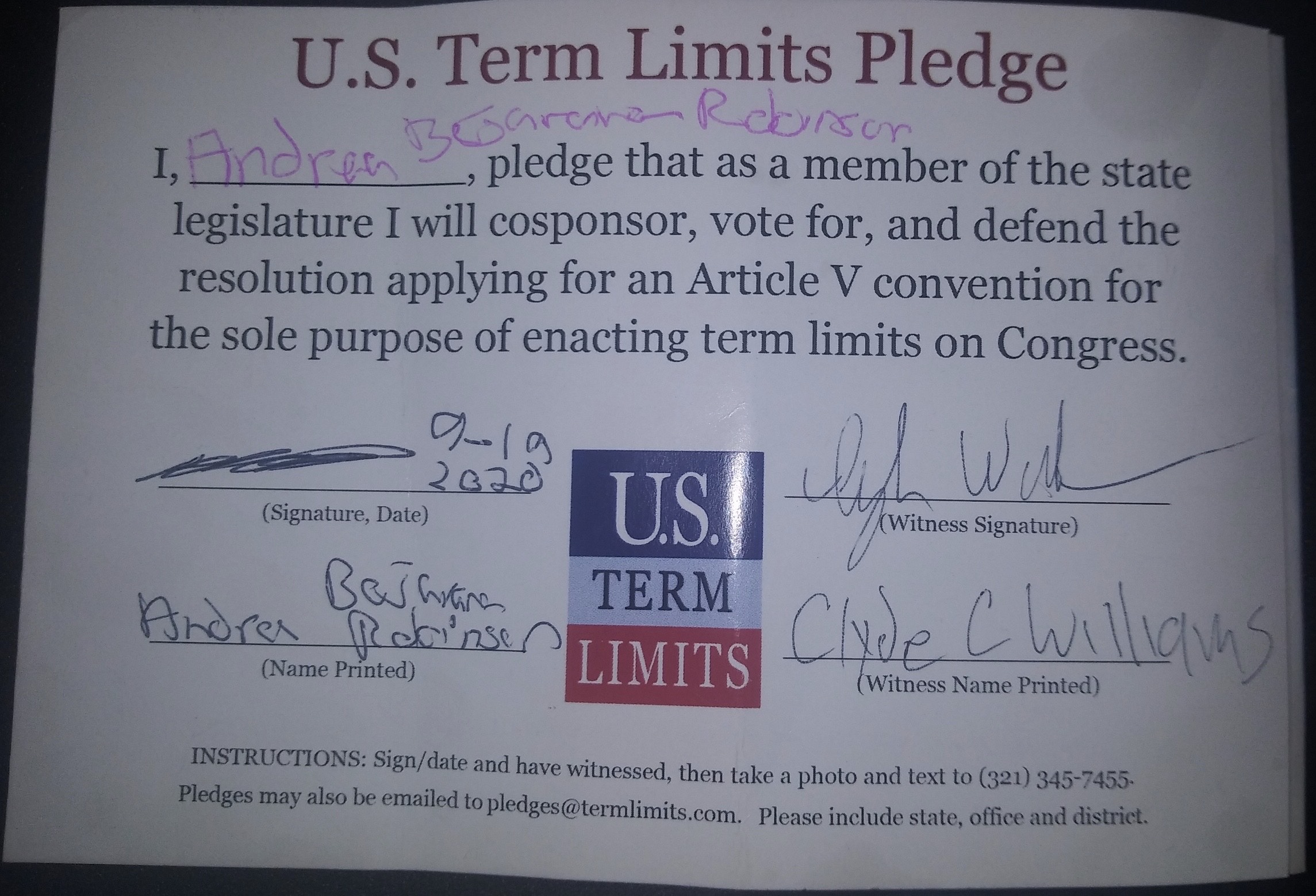 USTL President, Philip Blumel, commented on Robinson’s pledge saying, “Andrea’s support of term limits shows that there are individuals who are willing to listen to the majority of voters who want term limits. America needs a Congress that will be served by citizen legislators, not career politicians.”