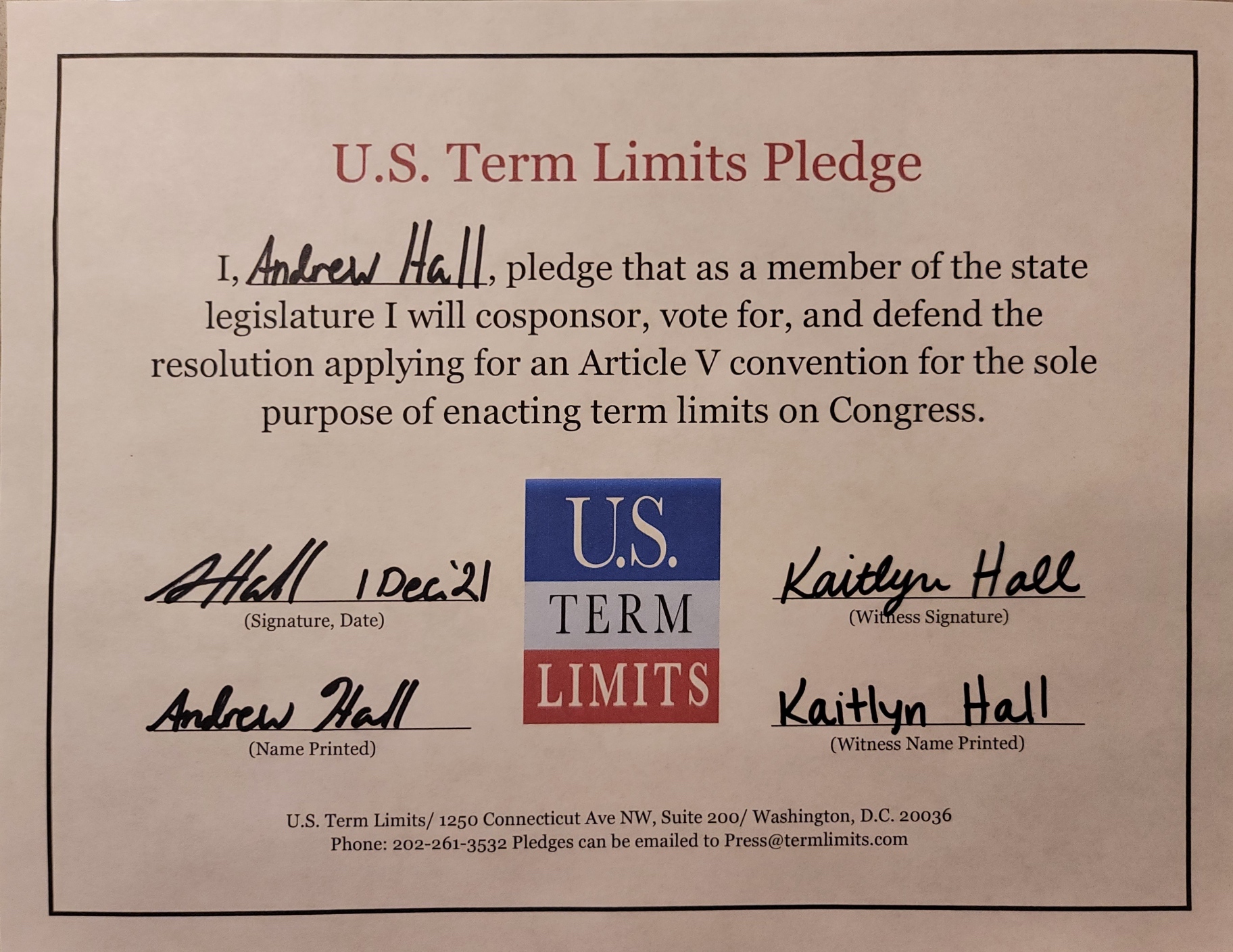 USTL President, Philip Blumel, commented on Hall’s pledge saying, “Andrew’s support of term limits shows that there are individuals who are willing to listen to the majority of voters who want term limits. America needs a Congress that will be served by citizen legislators, not career politicians.”
