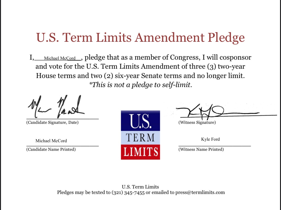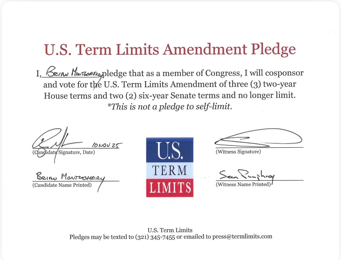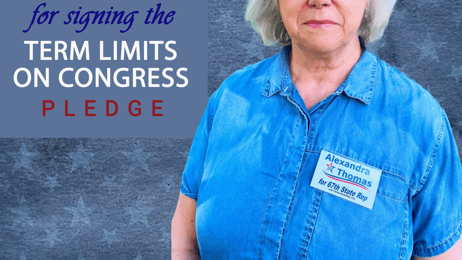 The U.S. Term Limits amendment pledge is provided to every announced candidate for federal office. It reads, “I pledge that as a member of Congress, I will cosponsor and vote for the U.S. Term Limits amendment of three (3) two-year House terms and two (2) six-year Senate terms and no longer limit.”