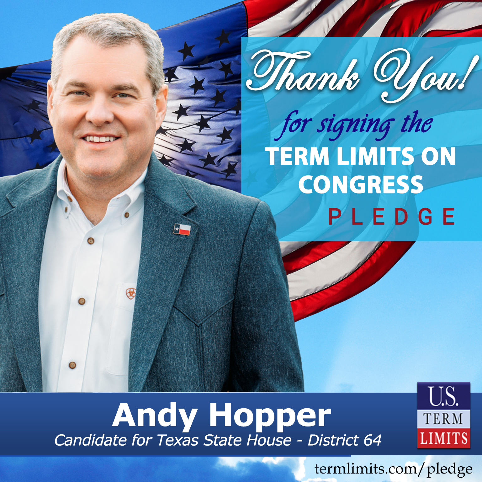 USTL President, Philip Blumel, commented on Hopper’s pledge saying, “Andy’s strong support of term limits shows that there are individuals who are willing to listen to the majority of voters who want term limits. America needs a Congress that will be served by citizen legislators, not career politicians.”