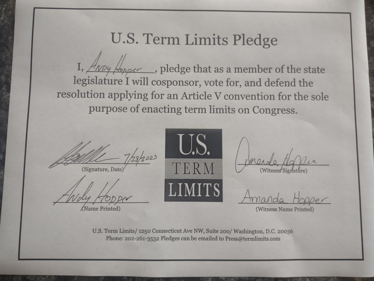 Andy Hopper Pledges to Support Congressional Term Limits