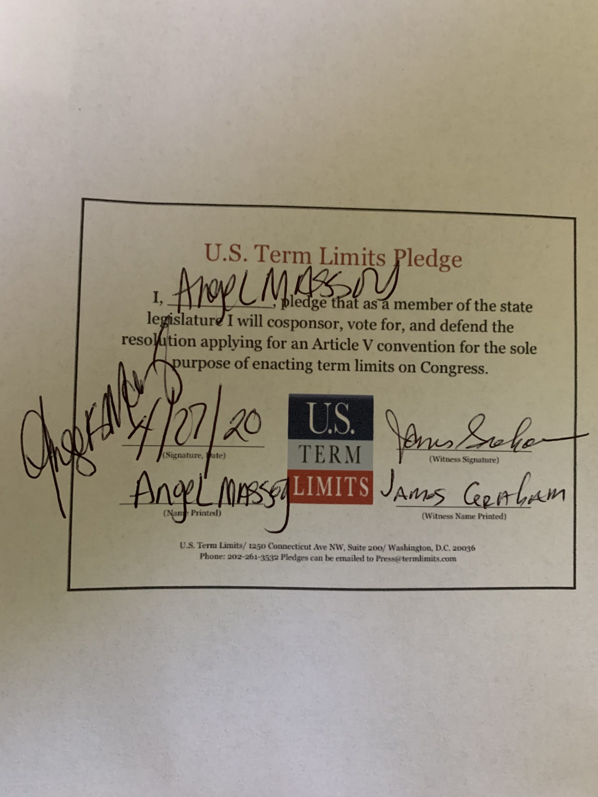 Washington, D.C. – U.S. Term Limits (USTL), the leader in the national, non-partisan movement to limit terms for elected officials, is gathering support from state lawmakers across the nation. Its mission is to get 34 states to apply for an amendment proposal convention specific to term limits on Congress. 2020 Georgia state house candidate Angel Massey (district 74), has committed support for term limits on Congress by signing the Term Limits Convention pledge. Massey is the first signer in this race. The primary election is scheduled for June 9, 2020.