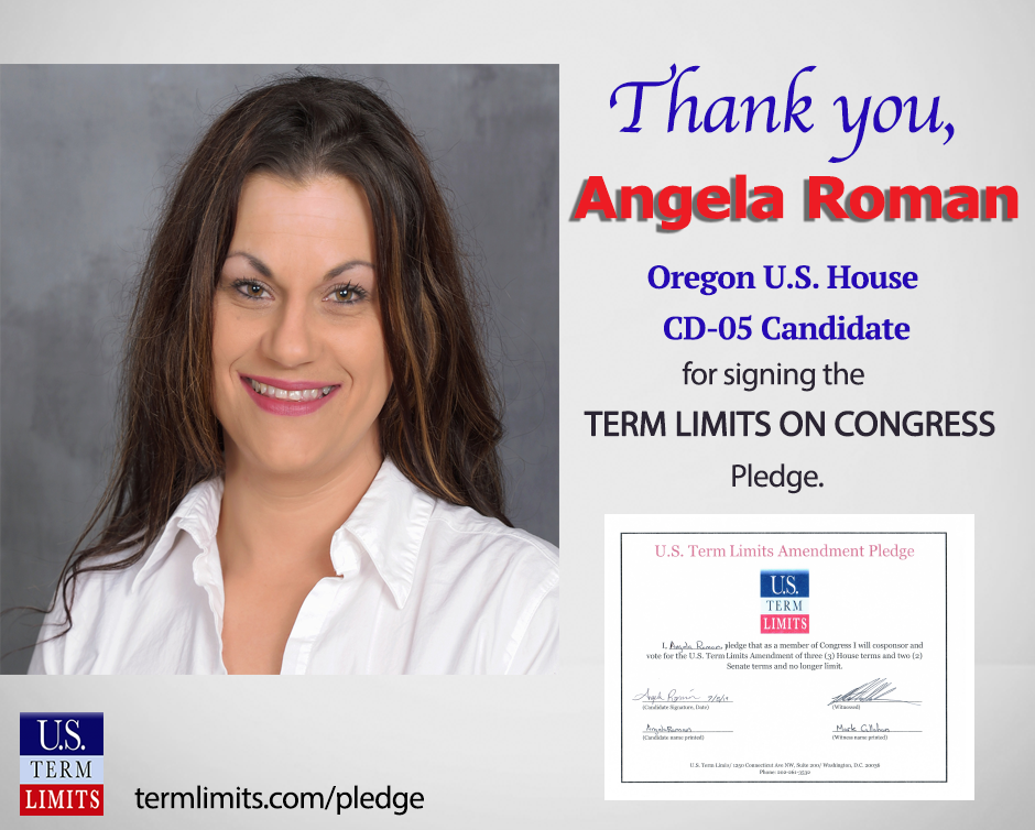 Washington, D.C. – U.S. Term Limits (USTL), the leader in the non-partisan national movement to limit terms for elected officials, praises Angela Roman, 2020 U.S. House candidate from Oregon’s 5th congressional district, for signing the pledge for an amendment to term limit Congress. She is the first of the declared candidates in that race to commit to supporting term limits on Congress.