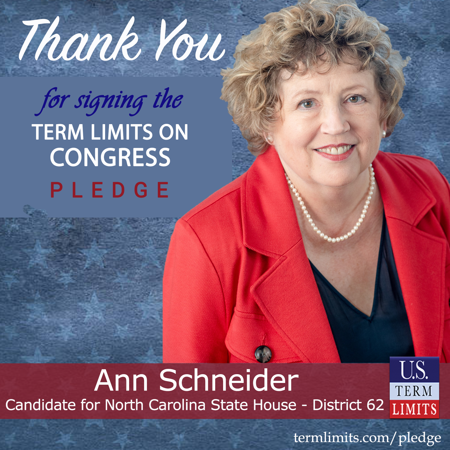 Raleigh, NC – U.S. Term Limits (USTL), the leader in the national, non-partisan movement to limit terms for elected officials, is gathering support from state lawmakers across the nation. Its mission is to get 34 states to apply for an amendment proposal convention specific to term limits on Congress. North Carolina state house candidate, Ann Schneider (District 62), has committed support for term limits on Congress by signing the term limits convention pledge. Schneider is the first signer in this race.